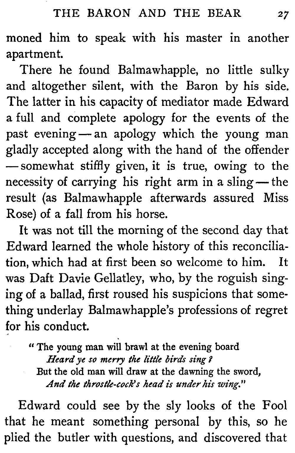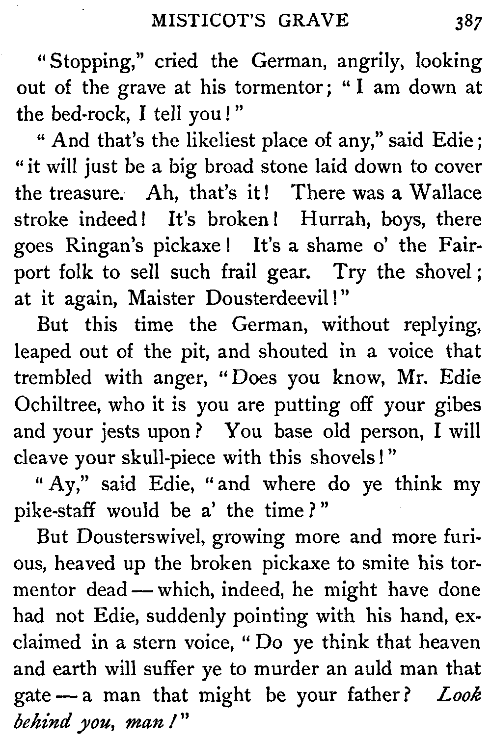 Lord Glenallan stared, as if hardly comprehending the old man's boldness in daring to bandy words with him. Then, without answering, he made him another signal to depart by a simple movement of his hand, which Edie, awed far beyond his wont, instantly obeyed.