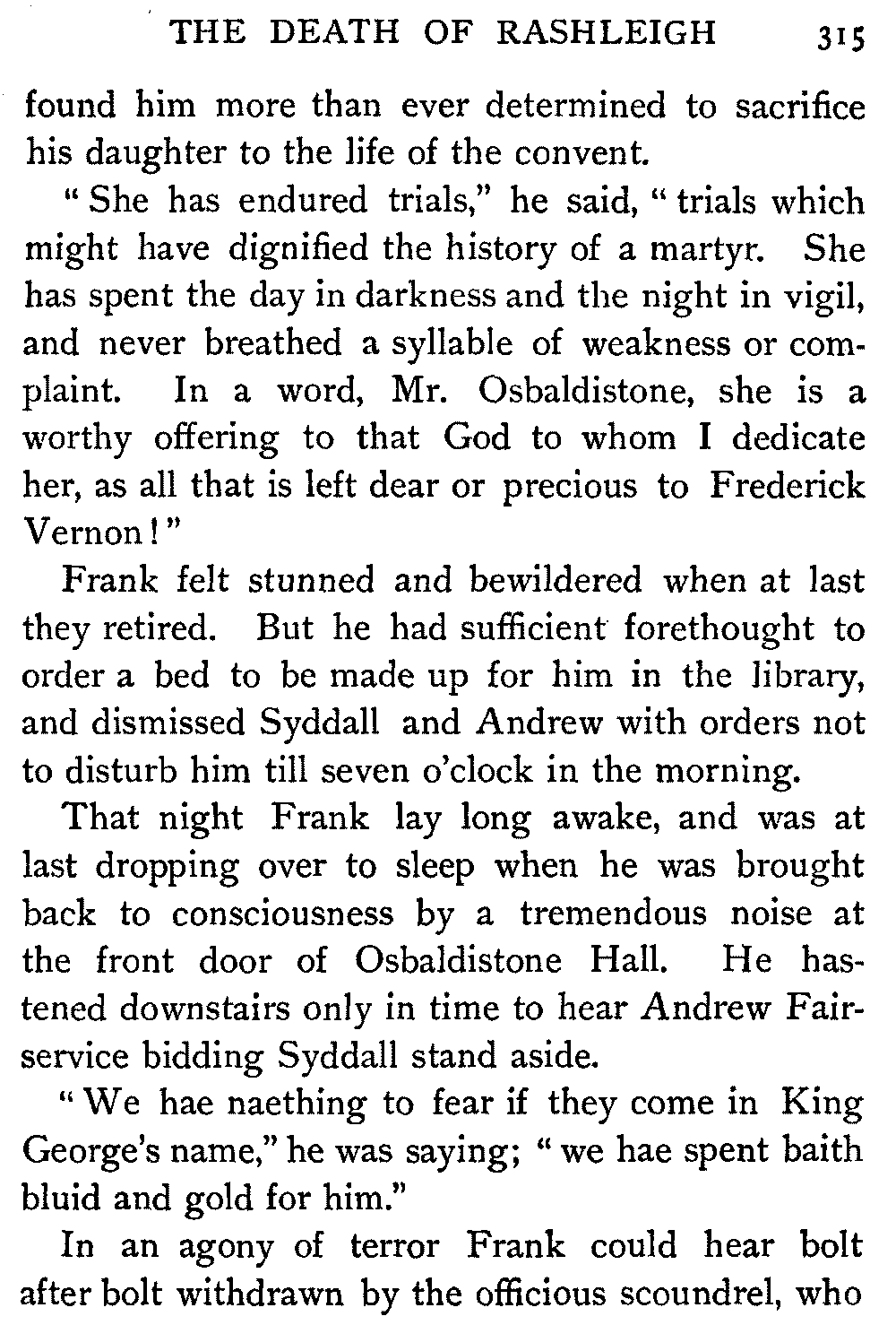 Lord Glenallan was going out of the hut, overwhelmed by the disclosure to which he had been listening. He saw his young wife hounded to death by his fierce and revengeful mother. He thought of the living child so wonderfully left to him as a legacy from the dead. Yet he turned at Elspeth's last words.[403]