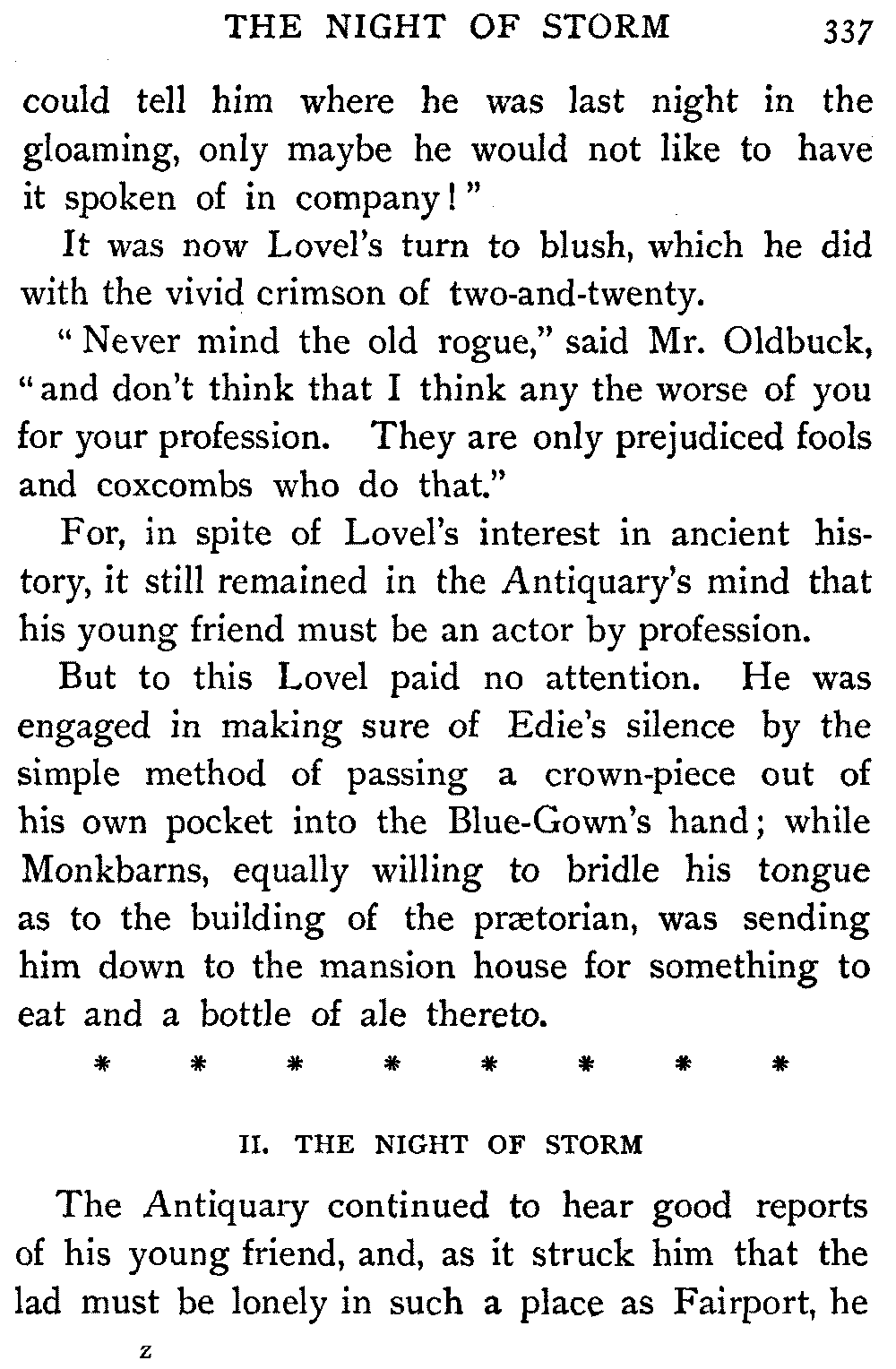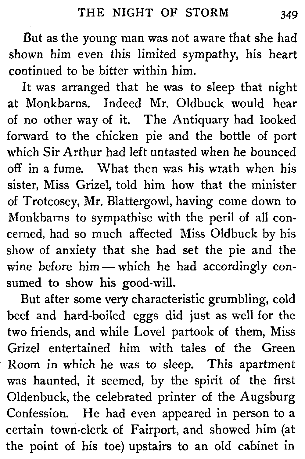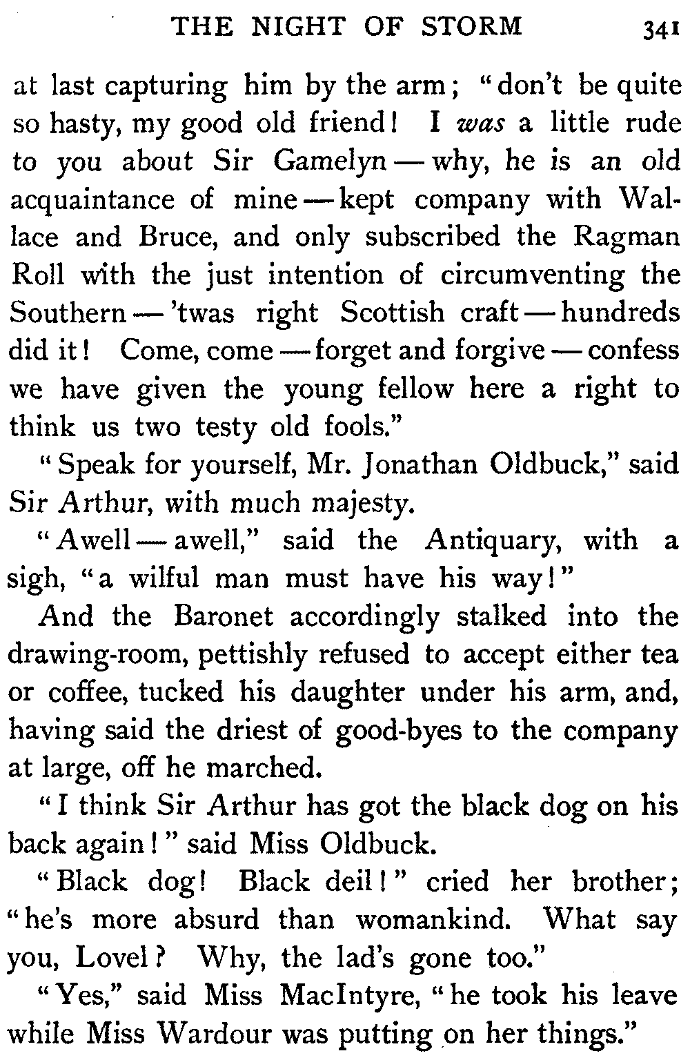 It was not in the good Antiquary's nature to refuse such a request from Earl or beggar, and their interview ended in the Earl's accepting the hospitality of Monkbarns for the night, in order that they might have plenty of time to discuss the whole subject of Elspeth's communication.