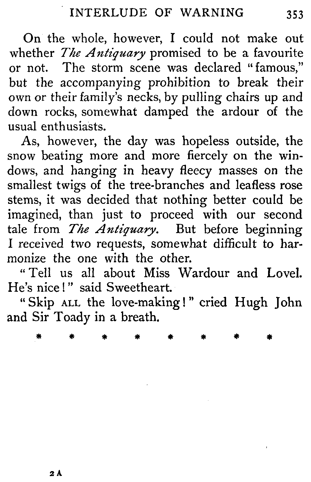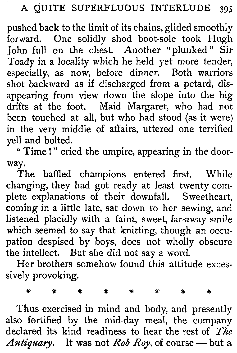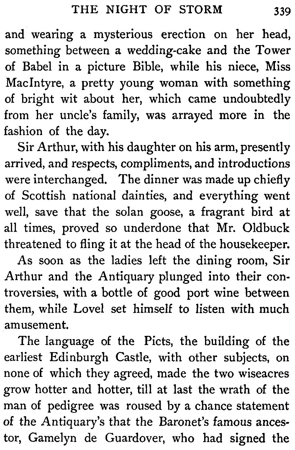 Thus exercised in mind and body, and presently also fortified by the mid-day meal, the company declared its kind readiness to hear the rest of The Antiquary. It was not Rob Roy, of course—but a[396] snowy day brought with it certain compensations. So to the crackle of the wood fire and the click and shift of the knitting needles, I began the final tale from The Antiquary.