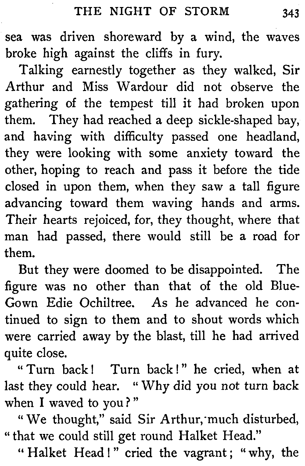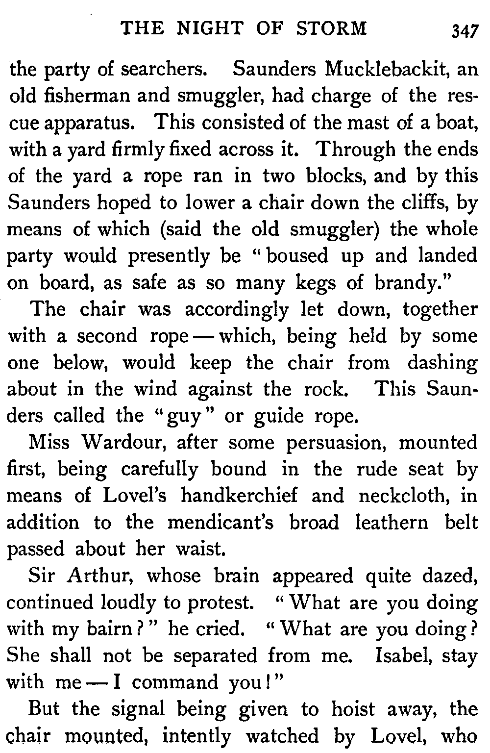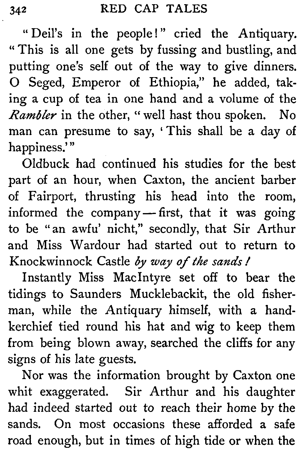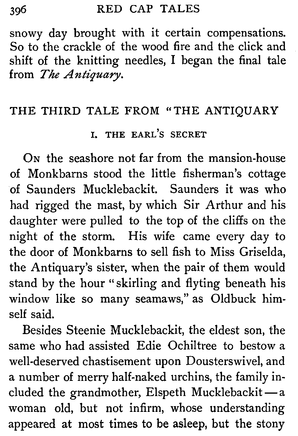 On the seashore not far from the mansion-house of Monkbarns stood the little fisherman's cottage of Saunders Mucklebackit. Saunders it was who had rigged the mast, by which Sir Arthur and his daughter were pulled to the top of the cliffs on the night of the storm. His wife came every day to the door of Monkbarns to sell fish to Miss Griselda, the Antiquary's sister, when the pair of them would stand by the hour "skirling and flyting beneath his window like so many seamaws," as Oldbuck himself said.