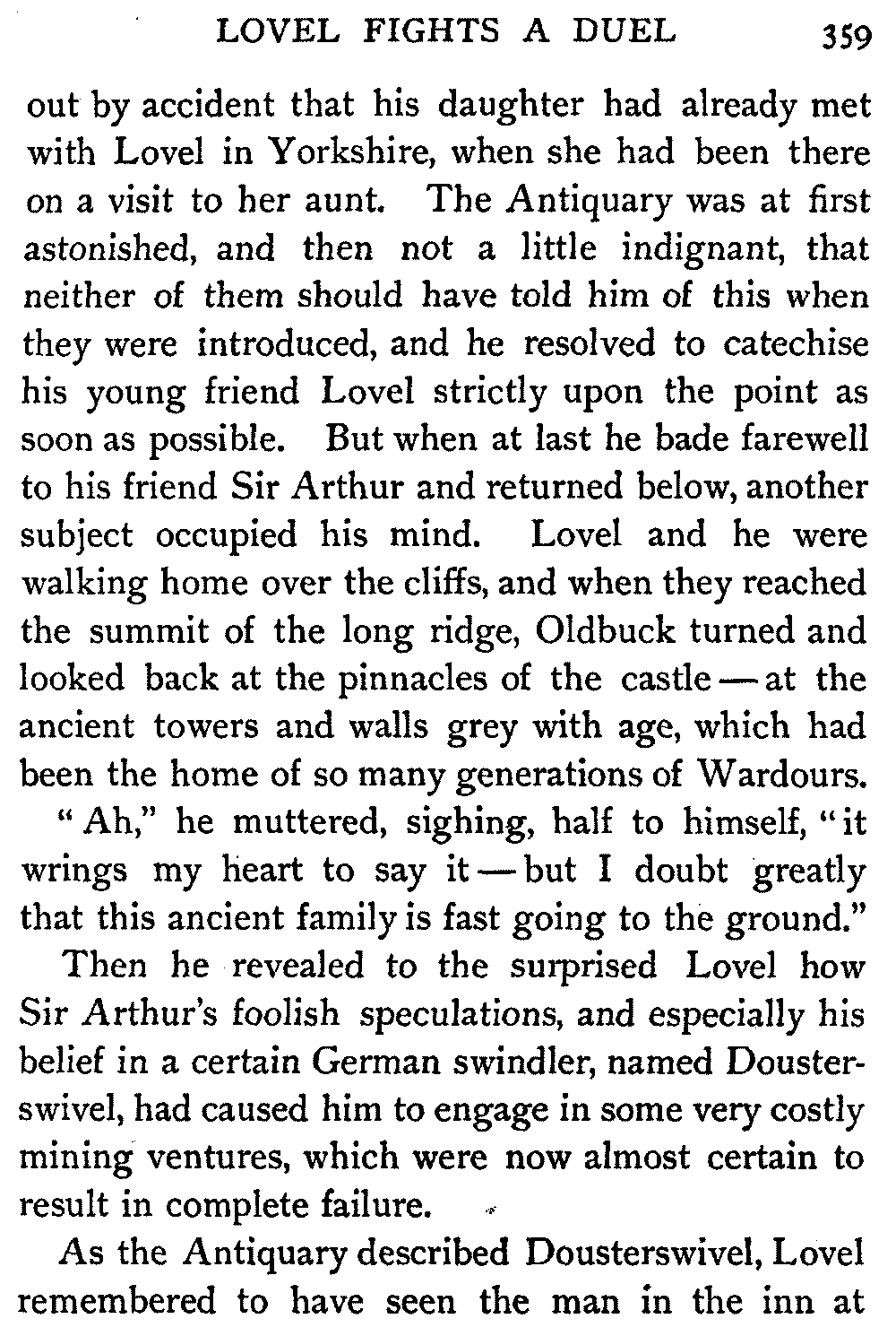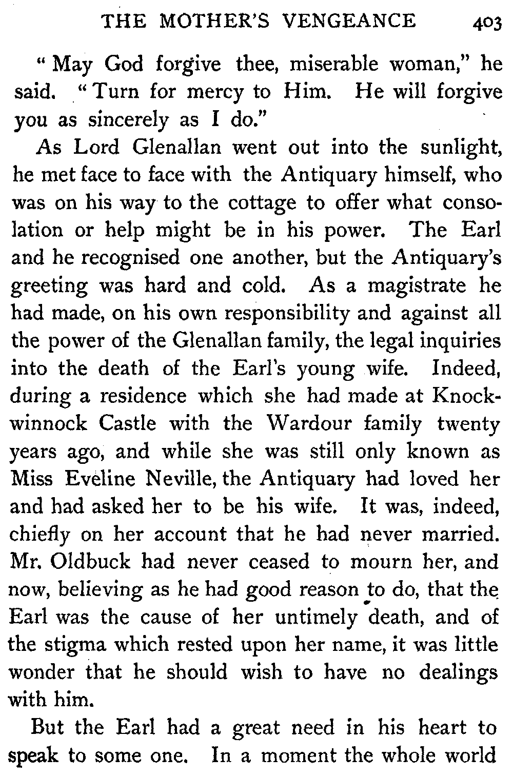 As Lord Glenallan went out into the sunlight, he met face to face with the Antiquary himself, who was on his way to the cottage to offer what consolation or help might be in his power. The Earl and he recognised one another, but the Antiquary's greeting was hard and cold. As a magistrate he had made, on his own responsibility and against all the power of the Glenallan family, the legal inquiries into the death of the Earl's young wife. Indeed, during a residence which she had made at Knockwinnock Castle with the Wardour family twenty years ago, and while she was still only known as Miss Eveline Neville, the Antiquary had loved her and had asked her to be his wife. It was, indeed, chiefly on her account that he had never married. Mr. Oldbuck had never ceased to mourn her, and now, believing as he had good reason to do, that the Earl was the cause of her untimely death, and of the stigma which rested upon her name, it was little wonder that he should wish to have no dealings with him.