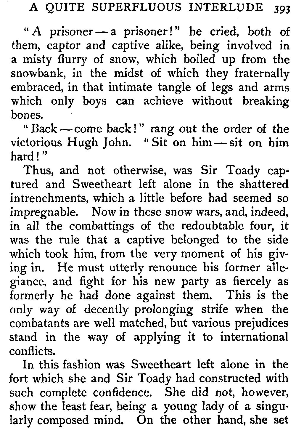 Thus, and not otherwise, was Sir Toady captured and Sweetheart left alone in the shattered intrenchments, which a little before had seemed so impregnable. Now in these snow wars, and, indeed, in all the combattings of the redoubtable four, it was the rule that a captive belonged to the side which took him, from the very moment of his giving in. He must utterly renounce his former allegiance, and fight for his new party as fiercely as formerly he had done against them. This is the only way of decently prolonging strife when the combatants are well matched, but various prejudices stand in the way of applying it to international conflicts.