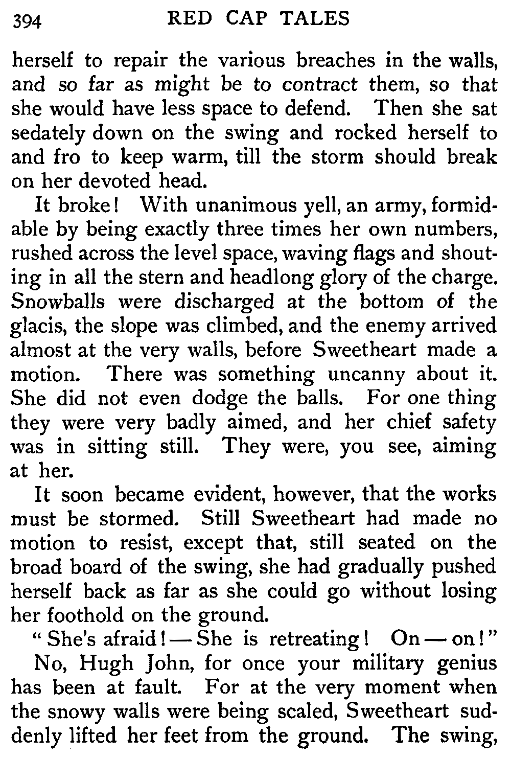 It broke! With unanimous yell, an army, formidable by being exactly three times her own numbers, rushed across the level space, waving flags and shouting in all the stern and headlong glory of the charge. Snowballs were discharged at the bottom of the glacis, the slope was climbed, and the enemy arrived almost at the very walls, before Sweetheart made a motion. There was something uncanny about it. She did not even dodge the balls. For one thing they were very badly aimed, and her chief safety was in sitting still. They were, you see, aiming at her.