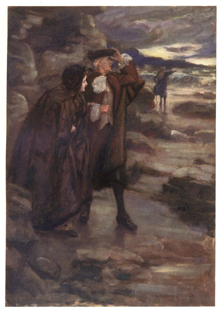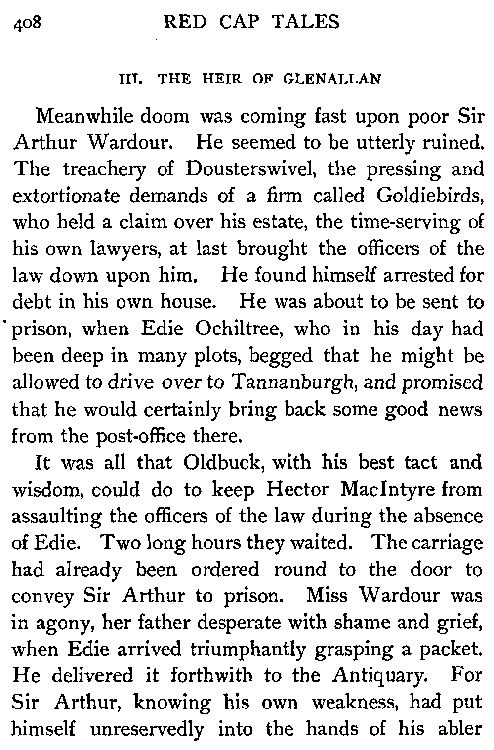 Meanwhile doom was coming fast upon poor Sir Arthur Wardour. He seemed to be utterly ruined. The treachery of Dousterswivel, the pressing and extortionate demands of a firm called Goldiebirds, who held a claim over his estate, the time-serving of his own lawyers, at last brought the officers of the law down upon him. He found himself arrested for debt in his own house. He was about to be sent to prison, when Edie Ochiltree, who in his day had been deep in many plots, begged that he might be allowed to drive over to Tannanburgh, and promised that he would certainly bring back some good news from the post-office there.