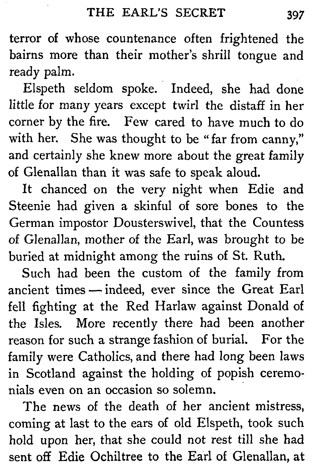 Elspeth seldom spoke. Indeed, she had done little for many years except twirl the distaff in her corner by the fire. Few cared to have much to do with her. She was thought to be "far from canny," and certainly she knew more about the great family of Glenallan than it was safe to speak aloud.