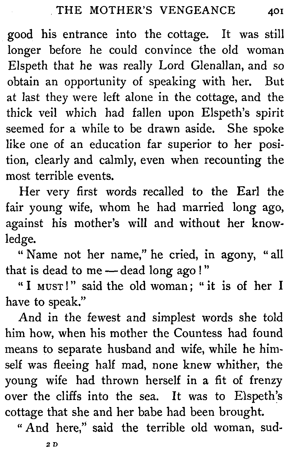 It was some time before the Earl could make[401] good his entrance into the cottage. It was still longer before he could convince the old woman Elspeth that he was really Lord Glenallan, and so obtain an opportunity of speaking with her. But at last they were left alone in the cottage, and the thick veil which had fallen upon Elspeth's spirit seemed for a while to be drawn aside. She spoke like one of an education far superior to her position, clearly and calmly, even when recounting the most terrible events.