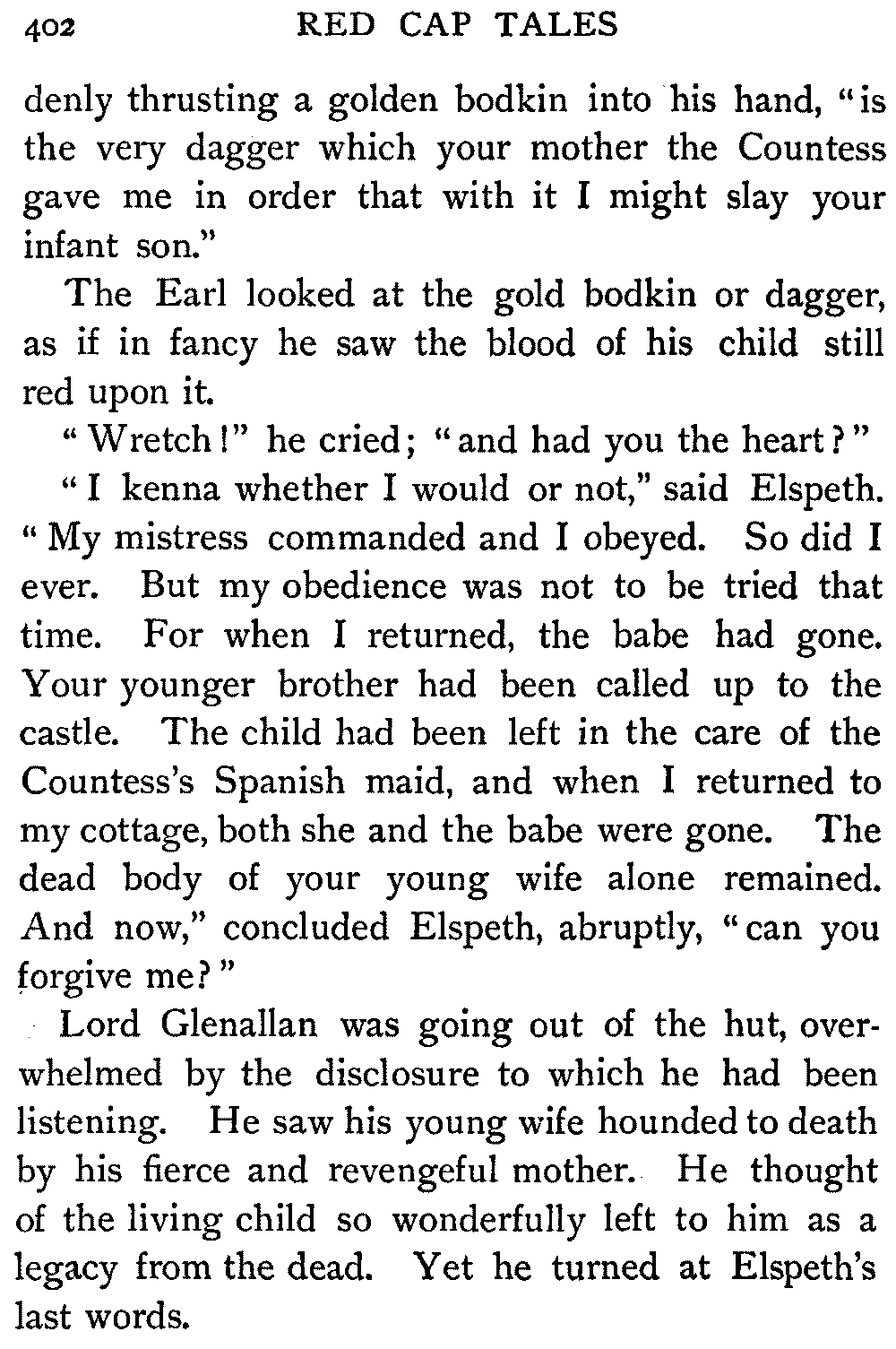 "I kenna whether I would or not," said Elspeth. "My mistress commanded and I obeyed. So did I ever. But my obedience was not to be tried that time. For when I returned, the babe had gone. Your younger brother had been called up to the castle. The child had been left in the care of the Countess's Spanish maid, and when I returned to my cottage, both she and the babe were gone. The dead body of your young wife alone remained. And now," concluded Elspeth, abruptly, "can you forgive me?"