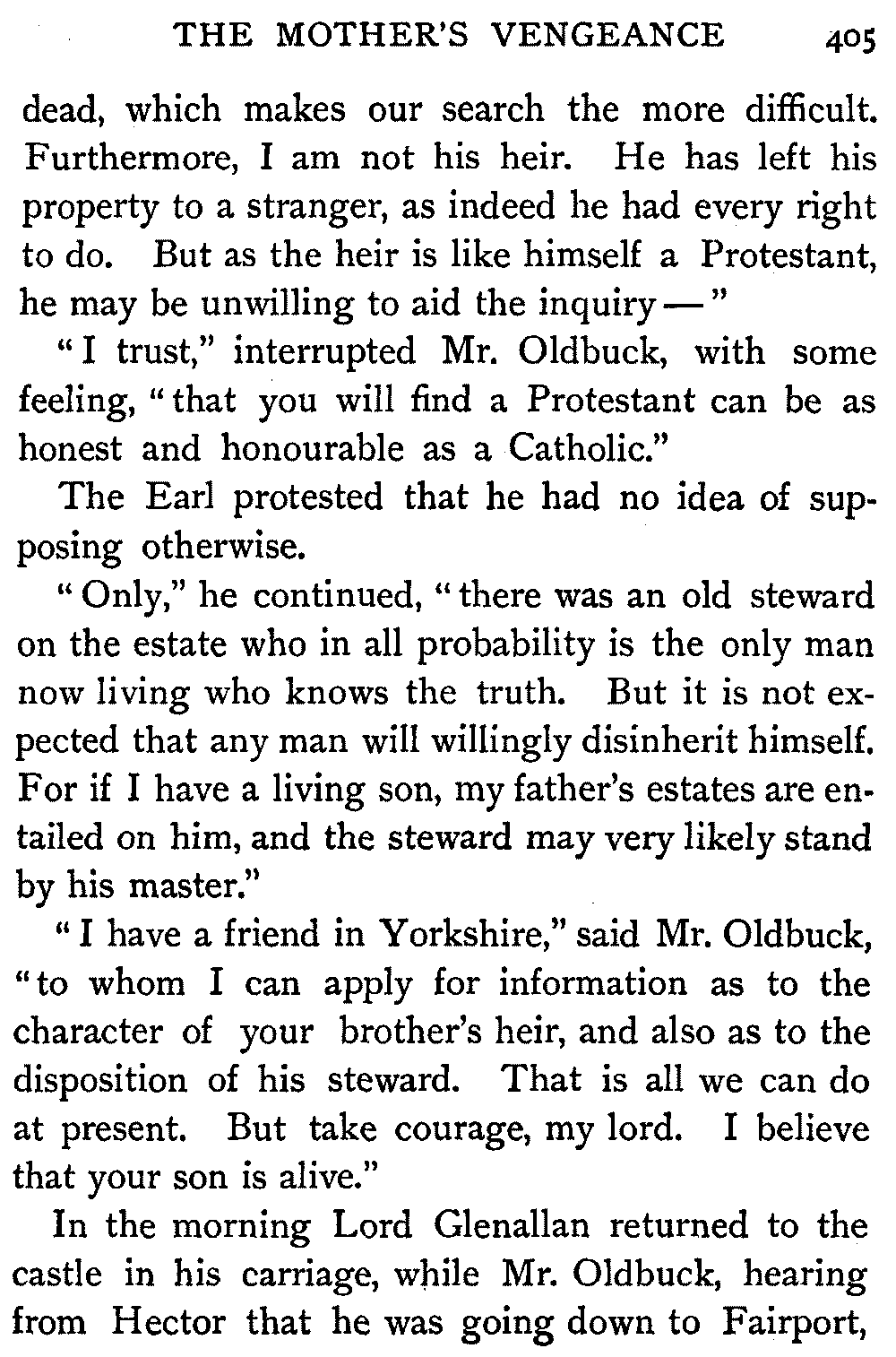 "My brother," said Lord Glenallan, "is recently[405] dead, which makes our search the more difficult. Furthermore, I am not his heir. He has left his property to a stranger, as indeed he had every right to do. But as the heir is like himself a Protestant, he may be unwilling to aid the inquiry—"