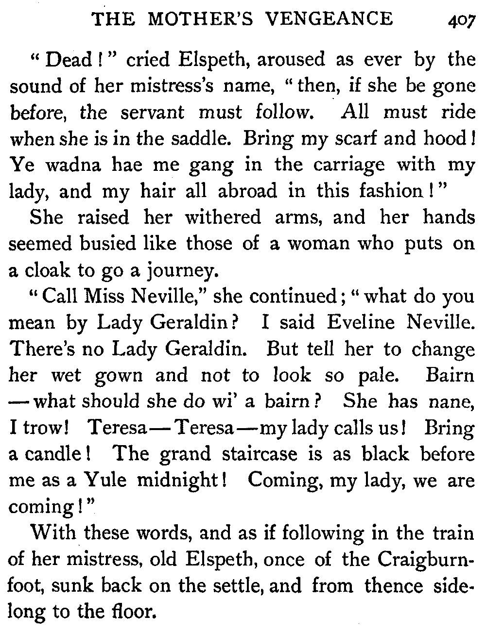 "Dead!" cried Elspeth, aroused as ever by the sound of her mistress's name, "then, if she be gone before, the servant must follow. All must ride when she is in the saddle. Bring my scarf and hood! Ye wadna hae me gang in the carriage with my lady, and my hair all abroad in this fashion!"