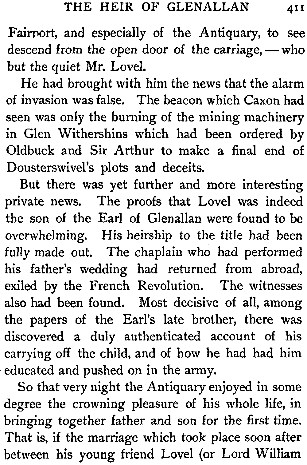 But there was yet further and more interesting private news. The proofs that Lovel was indeed the son of the Earl of Glenallan were found to be overwhelming. His heirship to the title had been fully made out. The chaplain who had performed his father's wedding had returned from abroad, exiled by the French Revolution. The witnesses also had been found. Most decisive of all, among the papers of the Earl's late brother, there was discovered a duly authenticated account of his carrying off the child, and of how he had had him educated and pushed on in the army.