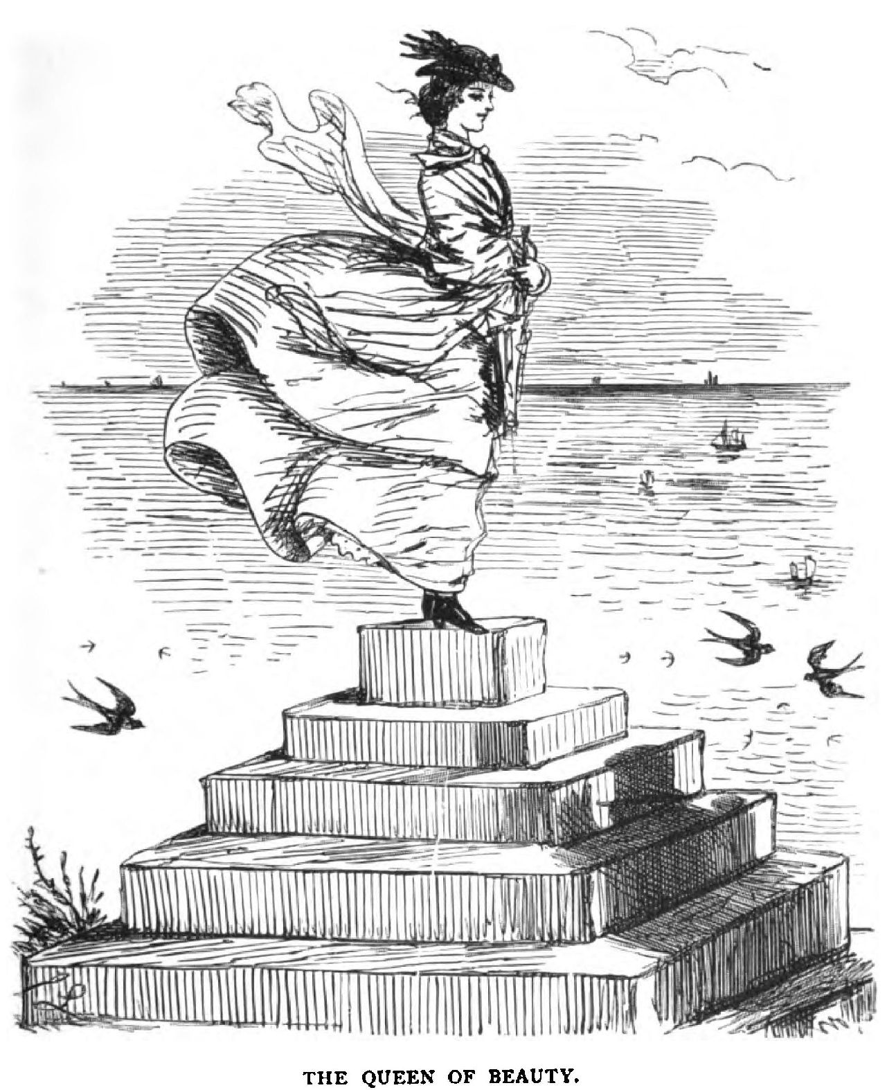 the enthronement of the Queen of Beauty.” And the sea-breeze forsook the jealous waves to woo her; the sunlight beamed on her with golden smiles; and the very swallow, turning from his favourite fly, flew past her, twittering admiration. Rough sailors out at sea that day caught sight of this fair vision through the glass, and ceased for half an hour to swear. There she stood, as