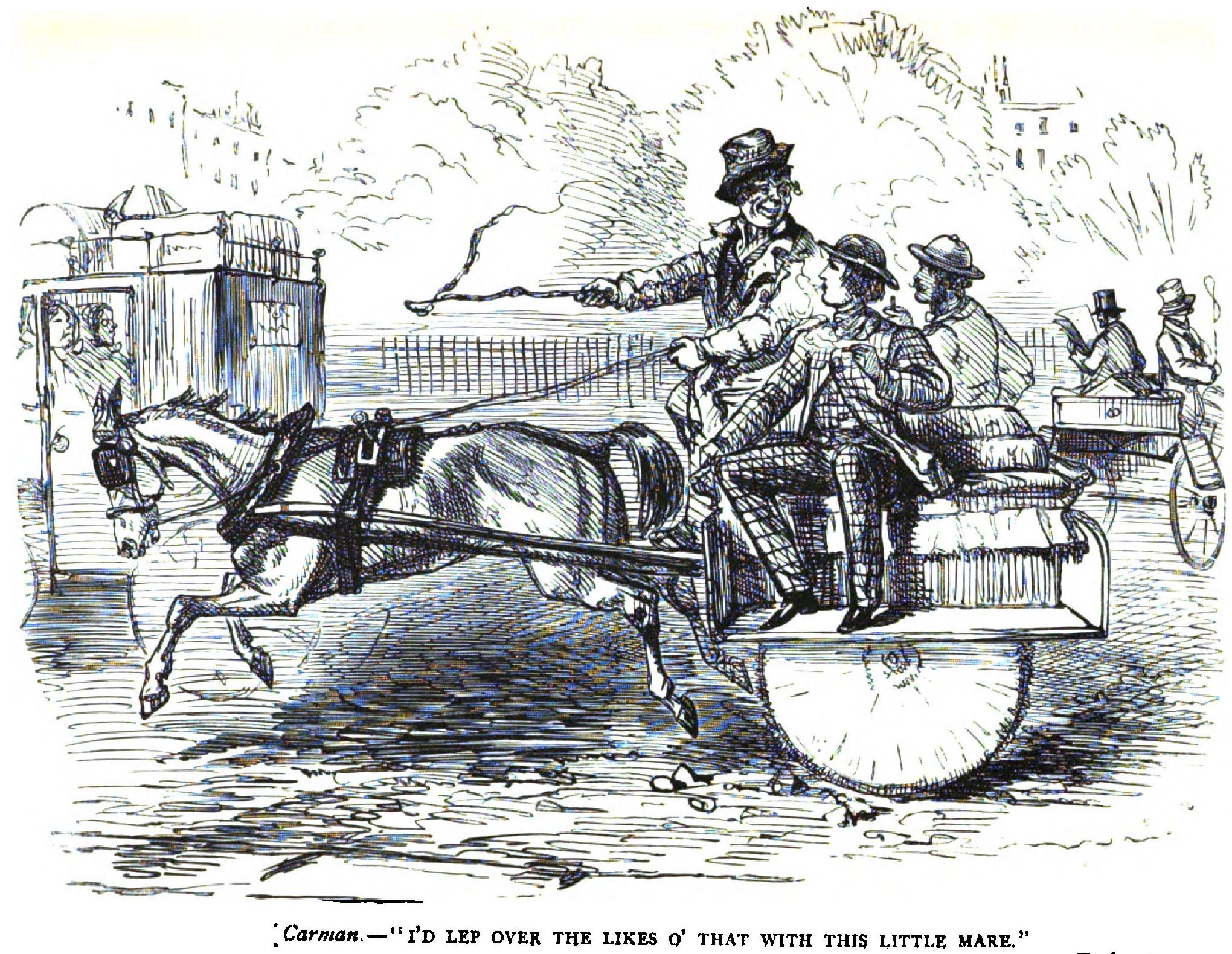 We had our first experience of Ireland proper when, emerging from the station at Dublin, we called for an “outside car,” and a son of Nimshi, responding in the distance, charged down upon us through a phalanx of vehicles, and reached us, I know not how, amid the acrimonious observations of his brethren. The first feeling, as we sat on the low-backed car, “travelling edgeways,” as Sir Francis Head designates this style of transit, was one of extreme insecurity, and though we laughed, and made believe that we liked it, we were glad enough to hold on by the iron-work until we arrived at Morrisson's. Our account with the charioteer was as follows:—