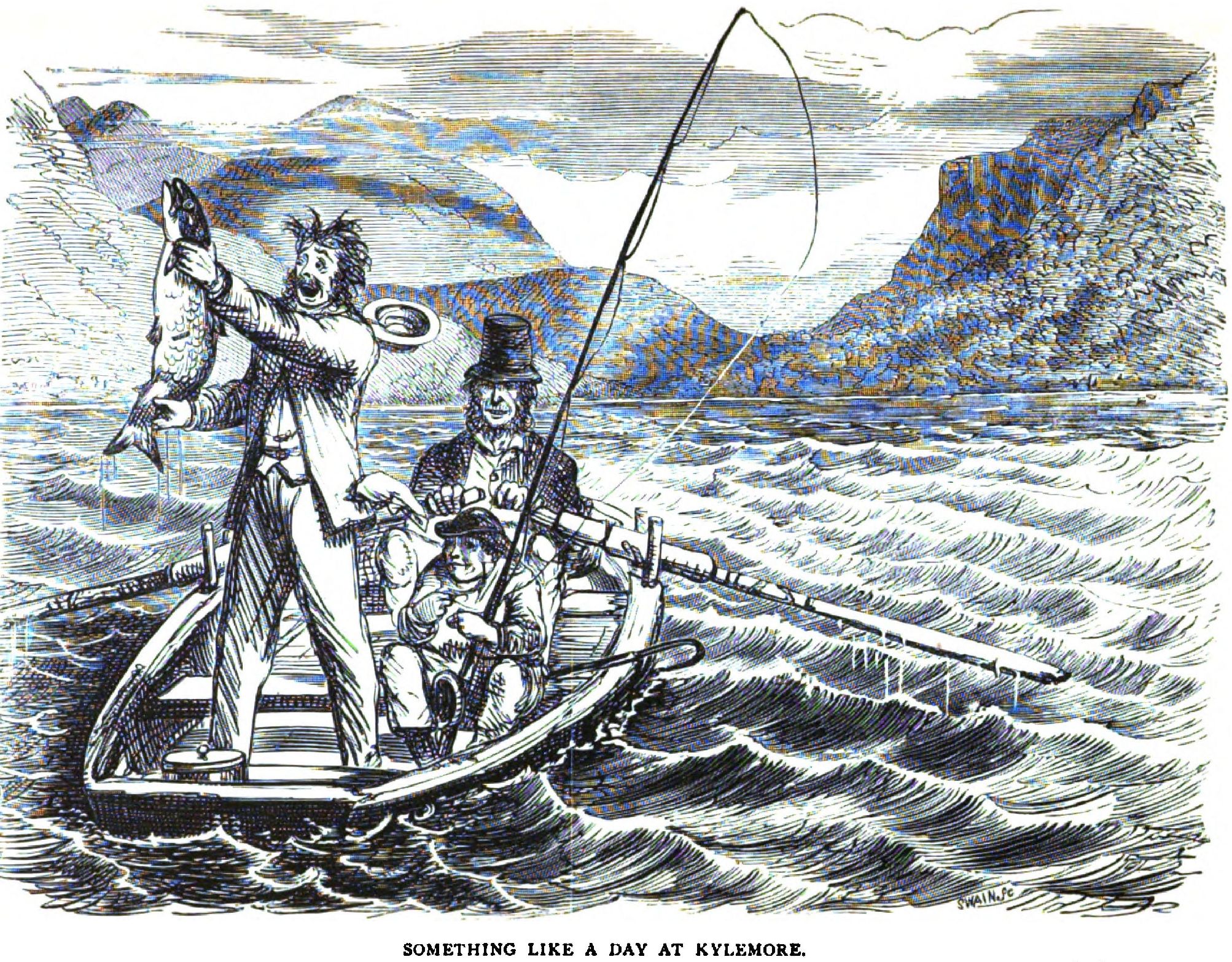 That night, and at the witching hour, when men and women tell each other everything, (in the strictest confidence), they in their dormitories, and we in our smoke-rooms, I revealed my misery to my friend Frank C————, who happened happily to be staying with me. Frank has Irish blood in his veins, and his first impulse was to have “a crack at the Viscount,” but he ultimately took a less truculent view of the case, and suggested brandy and water. From this source, and “from the cool cisterns of the midnight air,” for we were smoking our cigars out of doors, “our spirits drank repose,” and we finally resolved “to banish my regret,” and to replenish our sketch-books, by a fortnight's tour in Ireland.