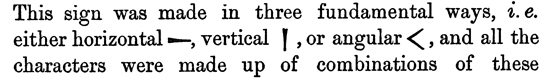 The alphabet is the first lesson of childhood, and it seems such a simple thing that we are apt to forget that it is one of the most important and original inventions of the human intellect. Some prehistoric genius, musing on the meaning of spoken words, has seen that they might all be analyzed into a few simple sounds. To 14 make this more easily intelligible, I will suppose the illustrations to be taken from our own language. "Dog" and "dig" express very different ideas; but a little reflection will show that the primary sounds made by the tongue, teeth, and palate, viz. 'd' and 'g,' are the same in each, and that they differ only by a slight variation in the soft breathing or vowel, which connects them and renders them vocal. The next step would be to see that such words as "good" or "God," consisted of the same root-sounds, only transposed and connected with a slight vowel difference. Pursuing the analysis, it would finally be discovered that the many thousand words of spoken language could all be resolved into a very small number of radical sounds, each of which might be represented and suggested to the mind through the eye instead of the ear by some conventional sign or symbol. Here is the alphabet, and here the art of writing.