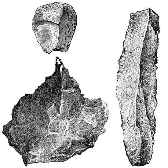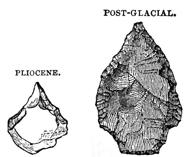 "Even these Californian remains do not exhaust the proofs of man's great antiquity in America, since we have the record of another discovery which indicates that he may, possibly, have existed at an even more remote epoch. Mr. E. L. Berthoud has described the finding of stone implements of a rude type in the Tertiary gravels of the Crow Creek, Colorado. Some shells were obtained from the same gravels, which were determined by Mr. T. A. Conrad to be species which are 'certainly not older than Older Pliocene, or possibly Miocene.'"