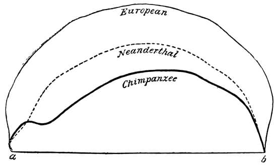 This inference of the priority of the Canstadt type 402 is strengthened by its undoubted approximation to that of the most savage existing races and of the anthropoid apes. If we take the skulls and skeletons of Neanderthal and Spy, and compare them with those of modern civilized man, we find that while they are still perfectly human, they make a notable approximation towards a savage and Simian type in all the peculiarities which have been described by anthropologists as tests. The most important of all, that of the capacity and form of the brain, is best illustrated by the subjoined diagram of the skulls of the European, the Neanderthal, and the chimpanzee placed in superposition.