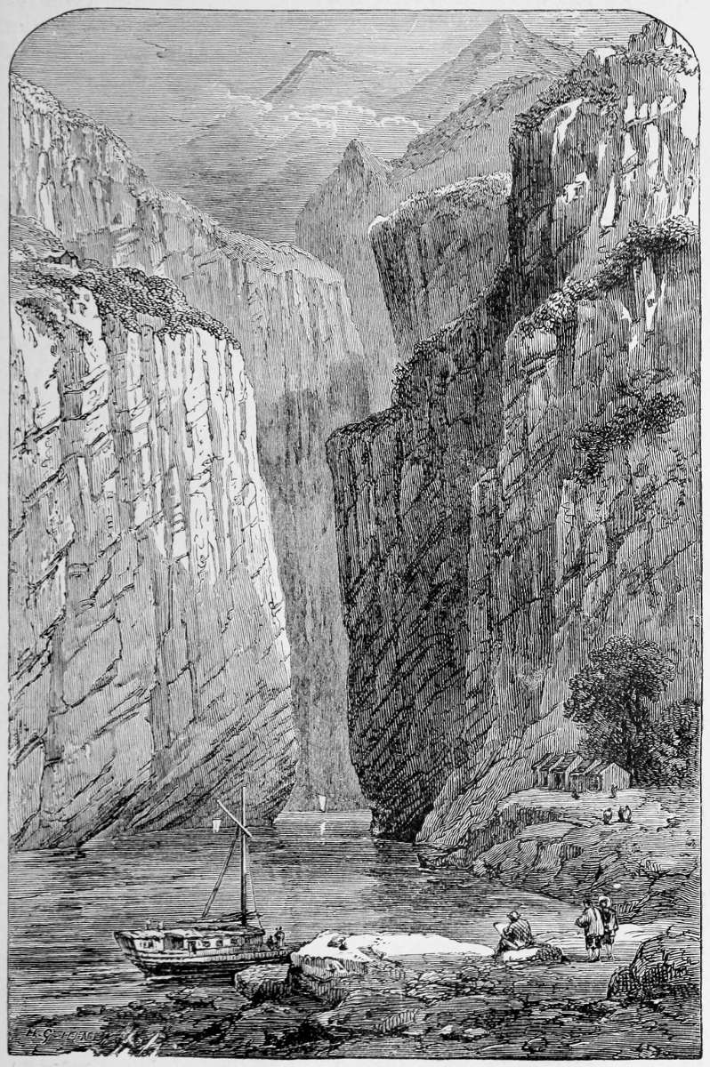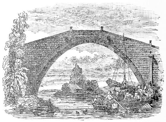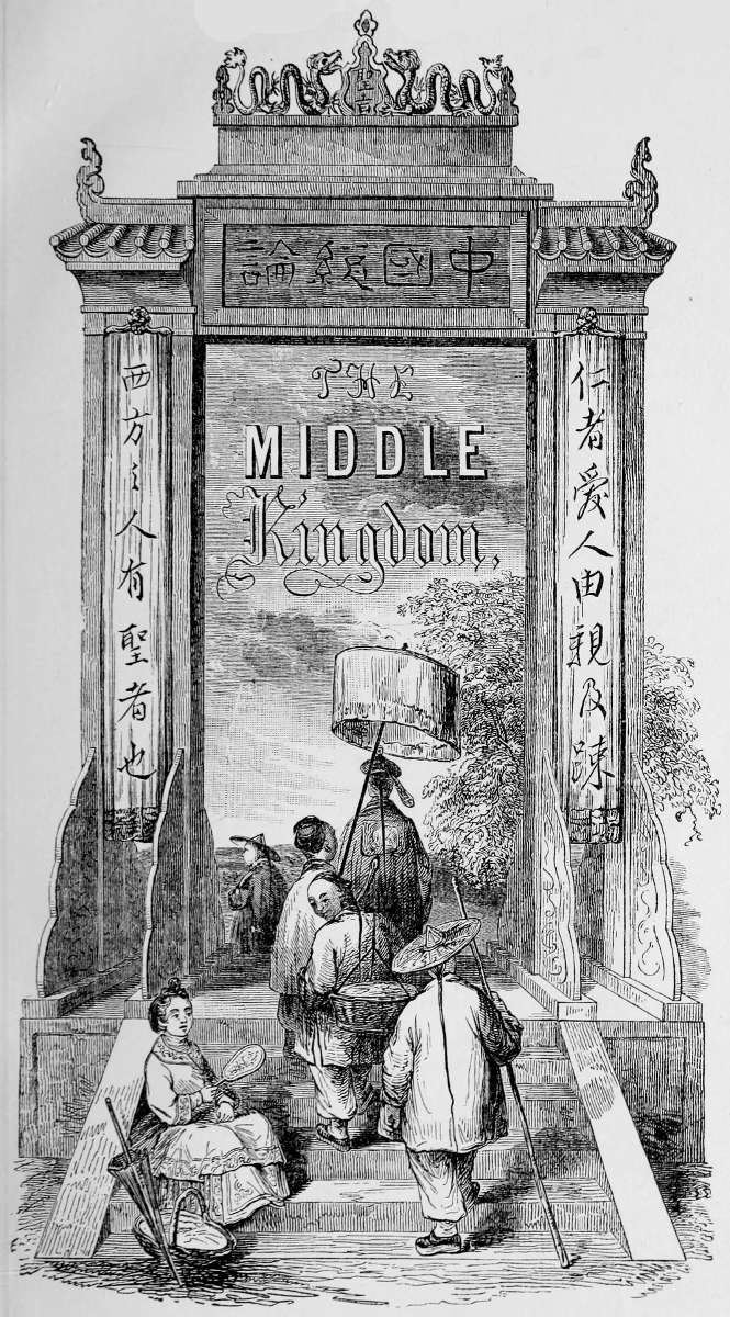 | Title-page, representing an honorary portal, or PAI-LAU. (The two characters, Shing chí, upon the top, indicate that the structure has been erected by imperial command. In the panel upon the lintel the four characters, Chung Kwoh Tsung-lun, ‘A General Account of the Middle Kingdom,’ express in Chinese the title of this work. On the right the inscription reads, Jin ché ngai jin yu tsin kih so, ‘He who is benevolent loves those near, and then those who are remote;’ the other side contains an expression attributed to Confucius, ‘Sí fang chí jin yu shing ché yé,’ ‘The people of the West have their sages.’)—Compare p. 757. | |