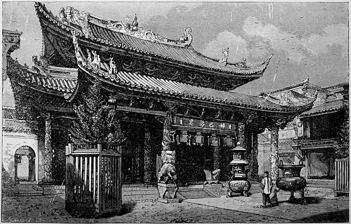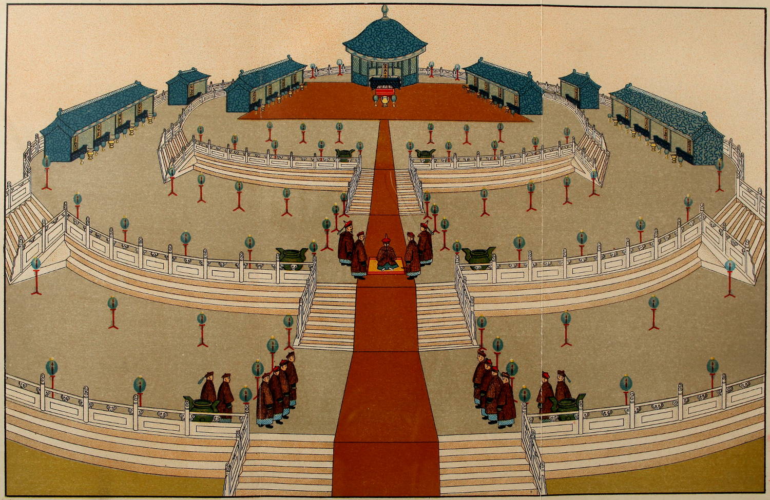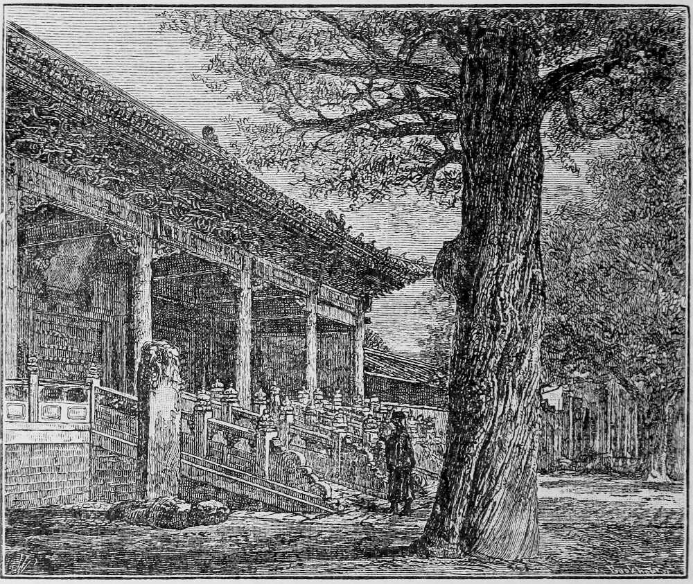 Upon the triple altar, or Tien Tan (Volume I., p. 76), the central temporary shrine is dedicated to Hwang-Tien Shangtí, or ‘Imperial Heaven’s Ruler above.’ Upon the Emperor’s right, nearest the chief pavilion, are tablets to his ancestors, Tienming, Shunchí, Yungching, and Kiaking; the corresponding opposite house is similarly devoted to Tientsung, Kanghí, Kienlung, and Taukwang. The small buildings behind and below these are the Taming chí Wei, the ‘Altar of the Sun’ or ‘Great Luminary’ (on the right), and the Ye-ming chí Wei, or ‘Altar of the Night Luminary.’ The last structure on the worshipper’s right contains tablets to the Chau-tien Sing, or ‘All Stars;’ to the Urh-shih pat Suhsing, or ‘Twenty-eight Constellations in the Ecliptic;’ to the Peh-tan Sing, or Ursa Major; and to the Muh, Kin, Shui, Fo, and Tu, or Five Elements—‘Wood, Metal, Water, Fire, and Earth.’ Facing this building on the left are shrines to Siueh-sz’, Yü-sz’, Fung-sz’, and Lui-sz’, the superintendents of Snow, Rain, Wind, and Thunder.