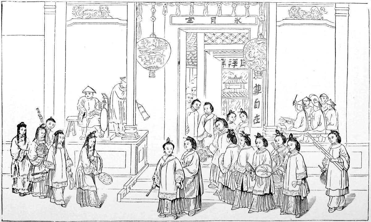 | Features and professions in Chinese society, 782; Social relations between the sexes, 784; Customs of betrothment and marriage, 785; Laws regulating marriages, 792; General condition of females in China, 794; Personal names of the Chinese, 797; Familiar and ceremonial intercourse: The Kotow, 800; Forms and etiquette of visiting, 802; A Chinese banquet, 807; Temperance of the Chinese, 808; Festivals; Absence of a Sabbath in China, 809; Customs and ceremonies attending New-Year’s Day, 811; The dragon-boat festival and feast of lanterns, 816; Brilliance and popularity of processions in China, 819; Play-houses and theatrical shows, 820; Amusements and sports: Gambling, chess, 825; Contrarieties in Chinese and Western usage, 831; Strength and weakness of Chinese character, 833; Their mendacity and deceit, 834. | |