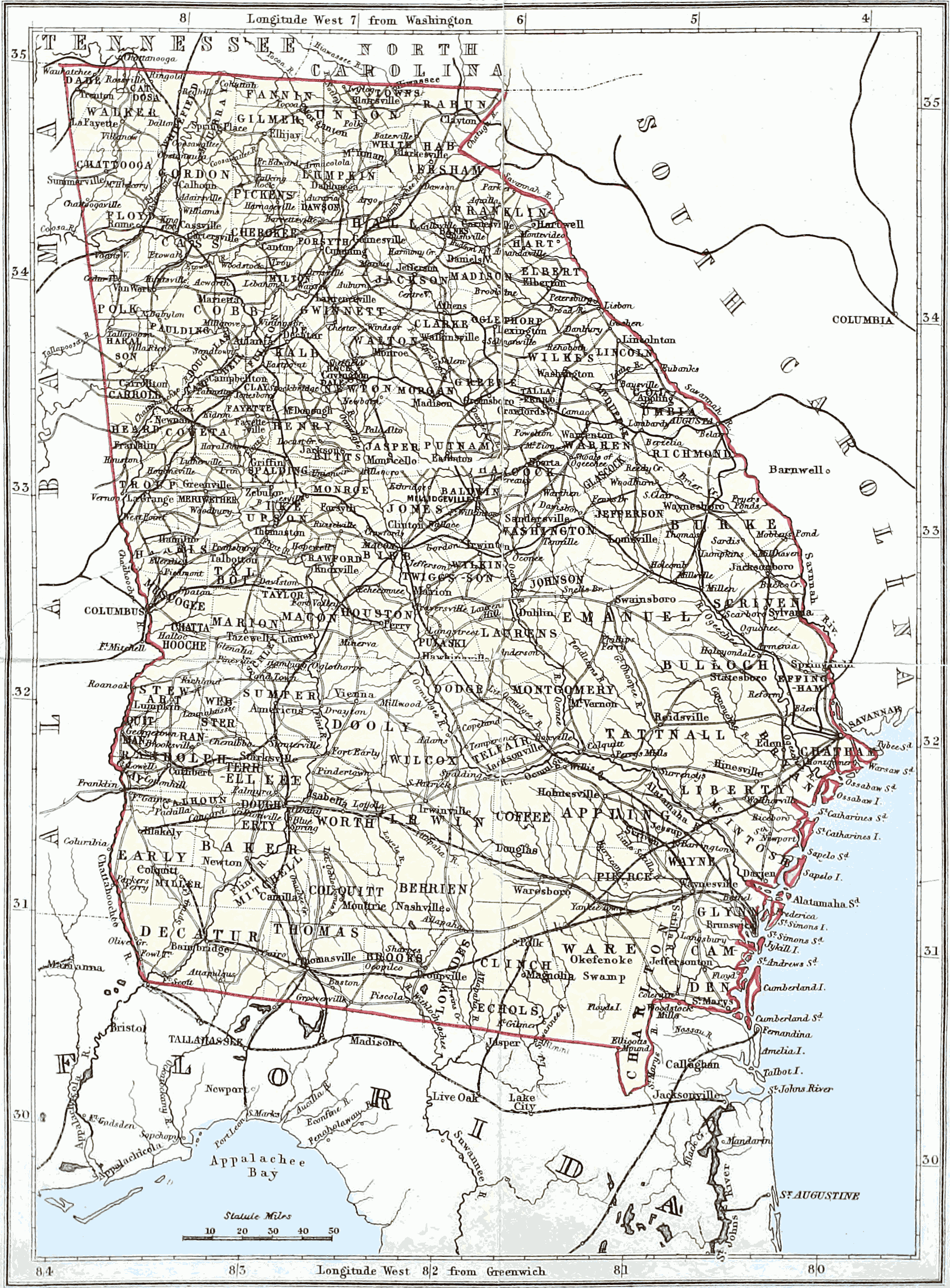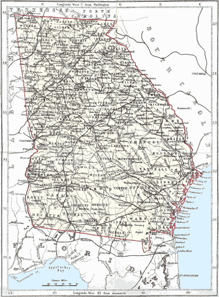 Georgia, one of the thirteen original States of the American Union, has Tennessee and North Carolina on the N., South Carolina and the Atlantic Ocean on the E., Florida S., and Alabama W. The Savannah river separates the State on the E. from South Carolina; the St. Mary’s, on the S., divides it in part from Florida; the Chattahoochee, on the W., flows between Georgia and Alabama for nearly half its course. Georgia lies between 30° 21′ 39″ and 35° N. lat., and between 81° and 85° 53′ 38″ W. long. It is 320 miles long from N. to S., and 256 miles in its greatest breadth from E. to W., with an area of 58,000 square miles.