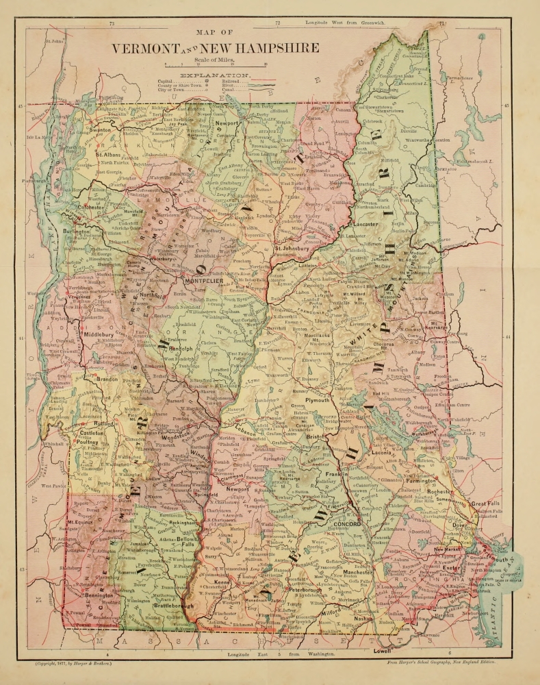 [15] Here is what Douglass says in his “Summary” (1748-’53): “The White Hills, or rather mountains, inland about seventy miles north from the mouth of Piscataqua Harbor, about seven miles west by north from the head of the Pigwoket branch of Saco River; they are called white not from their being continually covered with snow, but because they are bald atop, producing no trees or brush, and covered with a whitish stone or shingle: these hills may be observed at a great distance, and are a considerable guide or direction to the Indians in travelling that country.”