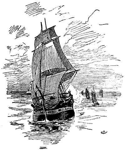 Once on board, Robinson watched the preparations for departure. At command the sailors clambered up into the rigging and loosened the sails. Then the captain from his bridge called out, "Hoist the anchor!" Then the great iron hooks that held the ship fast were lifted up, a cannon sounded a final farewell. Robinson stood on the deck. He saw the great city shimmer in the sunshine before him. Very fast now the land was being left behind. It was not long until all that could be seen of his native city was the tops of the highest towers. Then all faded from sight. Behind, in front, right and left, he saw nothing but waters.