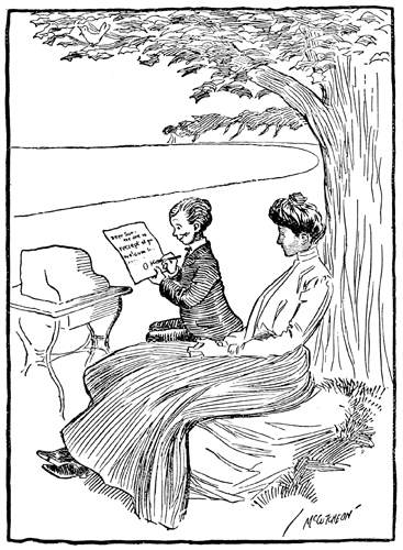 I'd like to have a lock of her brown hair, For that would be a part of her, you know; And if she'd tie it with a little bow Of ribbon, then I'd fasten it somewhere Clear down inside, next to my heart, to wear, And fix it over every week or so, When I changed undershirts, or maw she'd go And raise a fuss because she found it there. One day when bizness wasn't on the boom She trimmed her finger-nails, and one piece flew To where I was, almost acrost the room; I watched the spot where it went tumblin' to, And now a piece of her is mine; it come Right from the end of her dear little thumb. |
