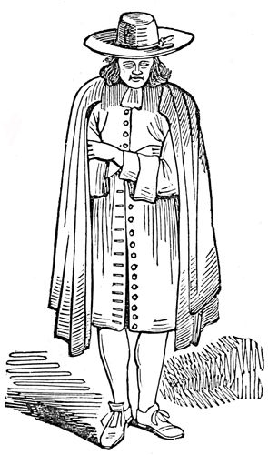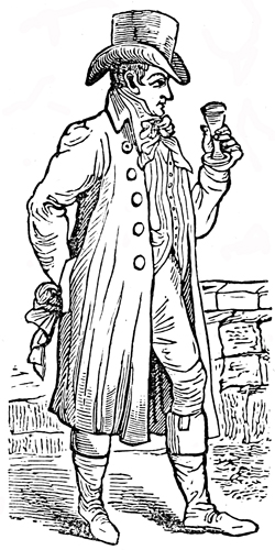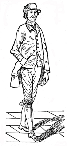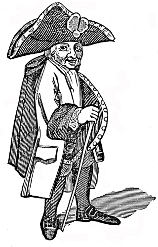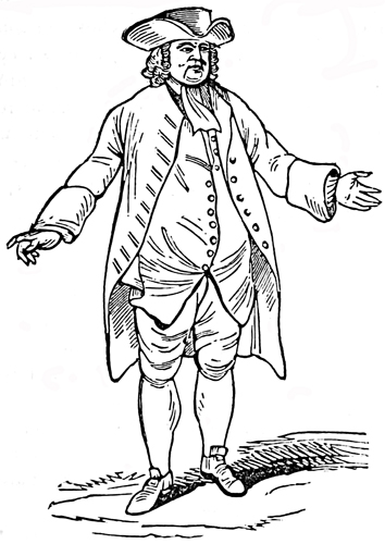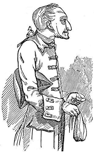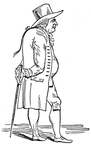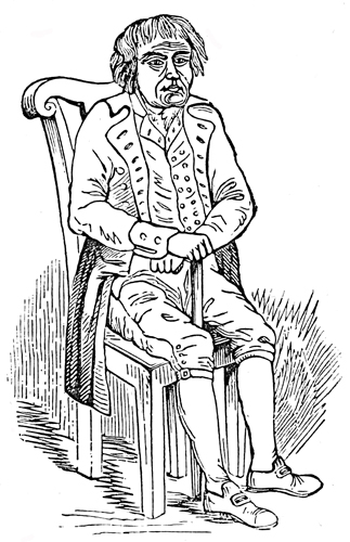 When he was somewhat advanced in life, he dismissed his fox-hounds, retrenched his expenses, and lived in the most parsimonious manner. Riches now[Pg 287] rolled in upon him like a torrent; at the same time, his mean, miserly propensities increased. When in London, he would walk home in the rain, rather than pay a shilling for a coach; and sit in his wet clothes, rather than have a fire to dry them. On one occasion, he wore a black wig above a fortnight, which he picked out of a rut in a lane, and which had probably been discarded by a beggar. While the black, stray wig was thus atop of his own gray hair, he one day tore his coat, and, in order to supply himself, resorted to an old chest of Sir Jervaise, his uncle's father. From this, he took the first he came to, which was a full-dress, green, velvet coat, with slashed sleeves. In this attire, he sat down to dinner: not even the solemn severity of his poor old servant could resist the ludicrous effect of his appearance.