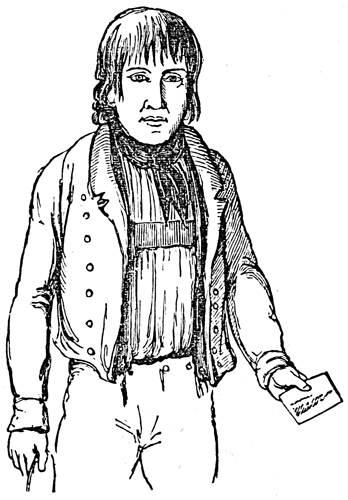 His height was seven feet two inches and a half: his head, and the upper parts of his body, were monstrous.[Pg 302] His arms were of such length as to touch his knees, when he stood erect. His whole weight was 360 pounds. At this period he was twenty-four years old. The annexed sketch gives a good idea of his appearance.