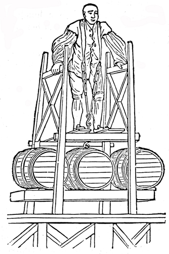 His fame for strength spread over the country, and his performances excited universal wonder. He would throw a horse over a turnpike gate, carry the beam of a house as a soldier his firelock, break a rope capable of sustaining twenty-two hundred weight, and bend a bar of iron an inch in diameter by striking it against his naked arm, into a bow! On one occasion, he found a watchman asleep in his box; he took them both on his shoulder, and carried them to the river, where he tipped them into the water. In May, 1741, he lifted three hogsheads of water, weighing 1836 pounds!