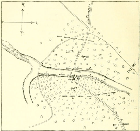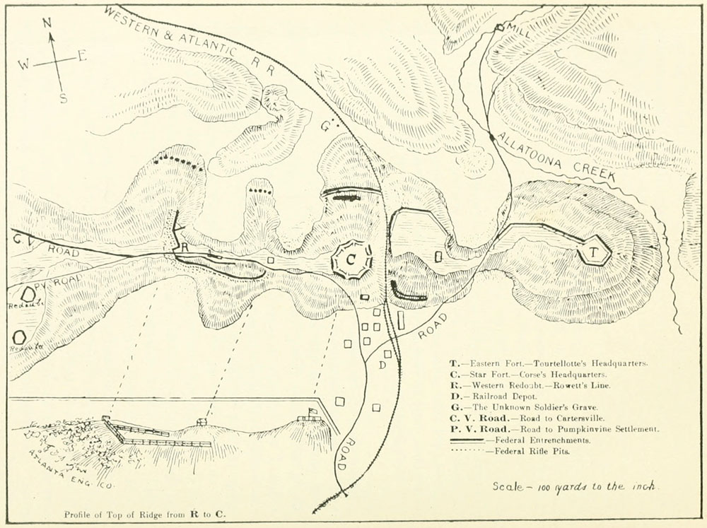[30] It is proper that I should here state that my official report (page 816, War Records, Vol. 39) contains an error. When I saw the Fiftieth and Twelfth Illinois leave the east side of the railroad and join the force on the west side, I believed that all were on that side, and wrote, "The Federal forces were now confined to one redoubt (fort 'C'), and we occupied the ditch." I did not discover this error until after it was too late to correct it. It must be remembered that the battle was fought on a mountain ridge, some of the sides inaccessibly steep, and covered with timber obstructing the view.