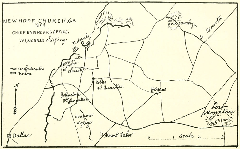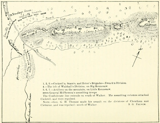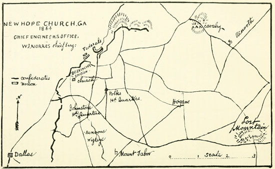 | Cassville—The Line of Battle—Hood's Line Not Enfiladed—History of That Conference—Two Lieutenant Generals Invite Their Commander to a Council of War—Johnston Obliged to Fall Back—We Cross the Etowah River—Dallas—New Hope Church—Constant Fighting—Rain, Rain—Death of Lieut. Gen. Polk—Battle of the Latimer House—My Division Occupies Little and Big Kennesaw Mountains—The Battle—Incidents of the Battle—Confederates Save Wounded Union Soldiers from Burning—Kennesaw During Night Bombardment—Col. Martin's Noble Conduct—The Irony of Fate—Maj. Poten and French Soldier | 196 |