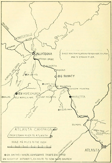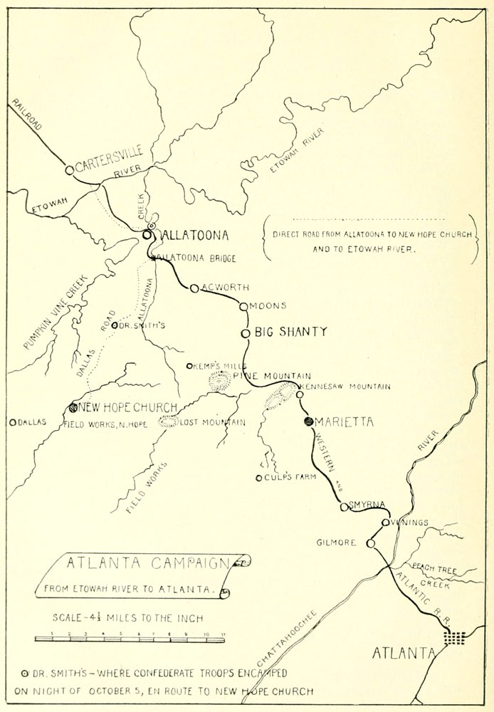 | From Lovejoy's to Lost Mountain—Big Shanty—Acworth—Destroying Railroad—In the Rear of Sherman—Situation of the Two Armies—Orders to Destroy the Etowah River Bridge—To Fill Up the Railroad Cut at Allatoona—Hood Not Aware that Allatoona Was Fortified and Garrisoned—March to Allatoona—Summons to Surrender—No Answer—Gen. Corse's Report Erroneous—The Fortifications—Strength of Forces—Equalization of Forces—Some Federal Dispatches—The Battle—Corse's Account—Col. Ludlow's Description—Desperate Fighting—The Main Line Captured—Enemy Driven into an Interior Fort—Dispatches from Gen. Armstrong Respecting Movements of the Enemy at Big Shanty—Withdraw to Avoid Being Surrounded by Converging Forces—Corse's Dispatch to Sherman—Provisions—Confederates Three Days and Nights without Rest or Sleep—Pass by the Enemy—Evangelist P. P. Bliss Writes the (Gospel) Hymn, "Hold the Fort"—Hood and His Erroneous Publications in His Book—His Admiration for Corse—My Admiration for the Confederates—The Soldier's Grave—The Lone Grave—Lieut. Gen. A. P. Stewart's Note in Regard to This Account of the Battle | 223 |