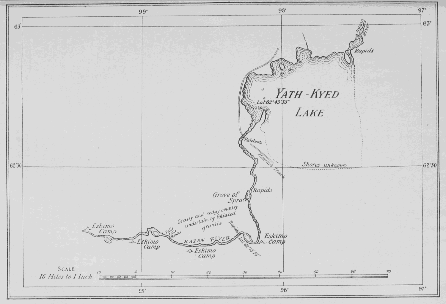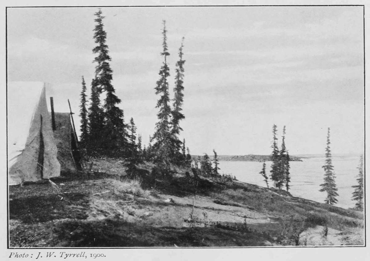 "I happen to be the only one since Hearne who has conducted explorations in the country lying between Fort Churchill and the eastern end of Great Slave Lake and south of latitude 63° N. Except Hearne, I and those who accompanied and assisted me are the only white men who have crossed that great stretch of country, north of a line between the mouth of the Churchill River and Lake Athabasca and a line between the east end of Great Slave Lake and Chesterfield Inlet. Absolutely the only information that I had about the region when I visited it, other than what I had secured in conversation with Indians, was contained in Hearne's book. My last journey was made sixteen years ago, and no white man has since travelled across that country. With the building of the railroad to Fort Churchill, it will doubtless soon be visited. Since I made a survey of Chesterfield Inlet and its vicinity, my brother, Mr. J. W. Tyrrell, has crossed from the east end of Great Slave Lake by the Hanbury River to Chesterfield Inlet, making a survey as he went, and the Royal North West Mounted Police have sent parties from the Mackenzie River to Hudson Bay along this route, using my brother's maps as their guide. It is hardly necessary to say that a magnificent field for exploration is still left in that far northern country."