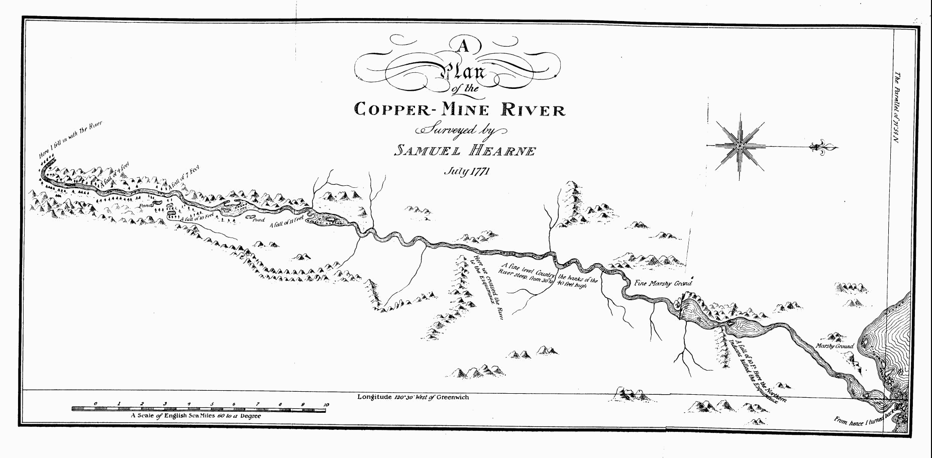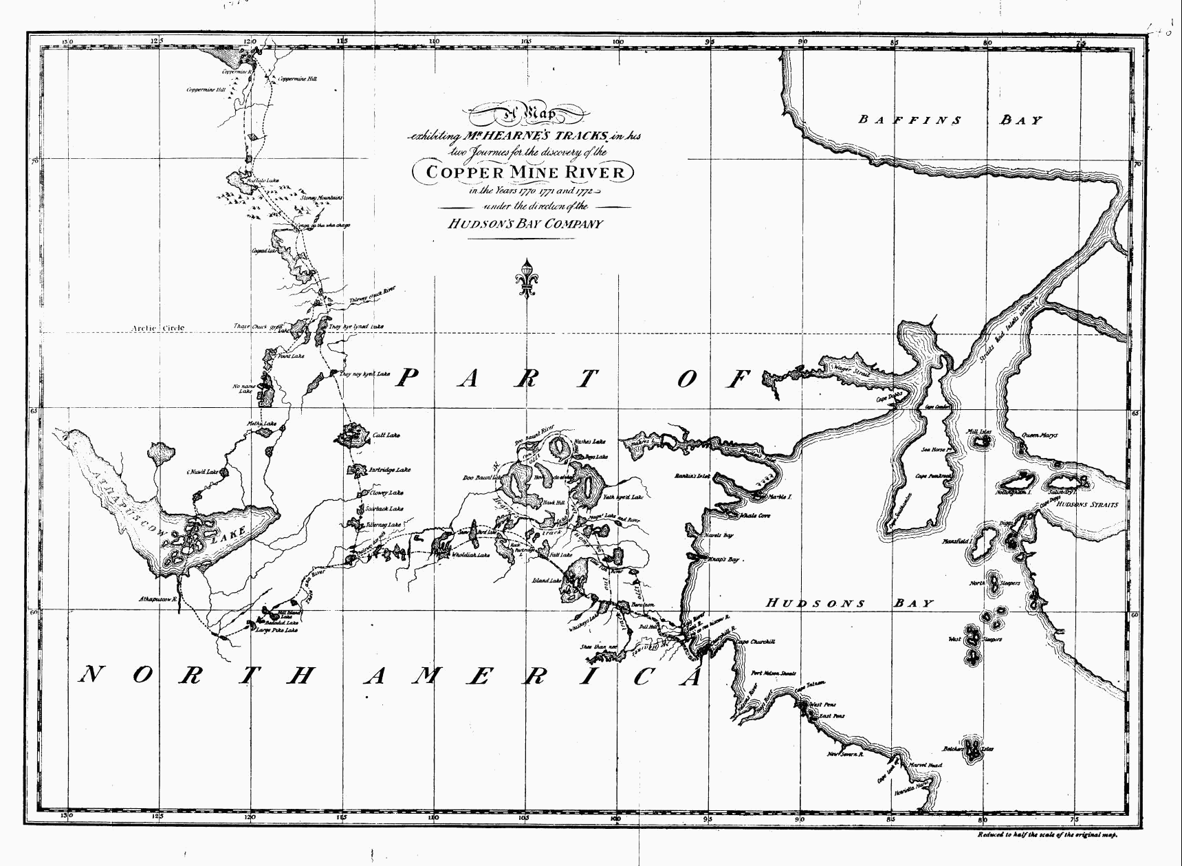 A MAP EXHIBITING MR. HEARNE'S TRACKS IN HIS TWO JOURNEYS FOR THE DISCOVERY OF THE COPPERMINE RIVER IN THE YEARS 1770, 1771, AND 1772