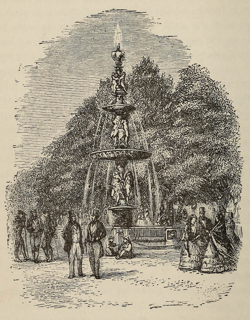 Perhaps the French and Italians are more disposed to make themselves merry in crowds. But on recalling the habits of the masses as they are seen in public places in 477Paris and Florence, I think that I was never in any city in the world where so many people in proportion to the whole number go from home to be amused. On the outskirts of the city—but not so far away as to be difficult of access—there are large gardens, so called, laid off with walks and shrubbery and fountains, and in the midst are all sorts of spectacular games and plays, combining in one enclosure theatre, circus, gymnastics, music and dancing, concerts, orations, and whatever is usually found scattered in different parts of a city, and to be visited only after paying a fee for each admission. To enter this garden—for one is a type of many—you pay about ten cents, and that gives you the entrée to nearly all the shows. The theatre may charge another trifling fee, but the one admission makes all these amusements open to the visitor. Around every stage are little tables and chairs, and refreshments are served, if you choose to call for them, at an extra charge. To such places as this thousands upon thousands of respectable people resort night after night, usually coming before dark, for the days are long and nights short; men bring their wives and children, and take their evening meal together in little stalls provided for the purpose, and go home in good season. This is their refreshment after a day of toil, and it is not unlikely that it helps them to bear with patience the burdens of a working life.