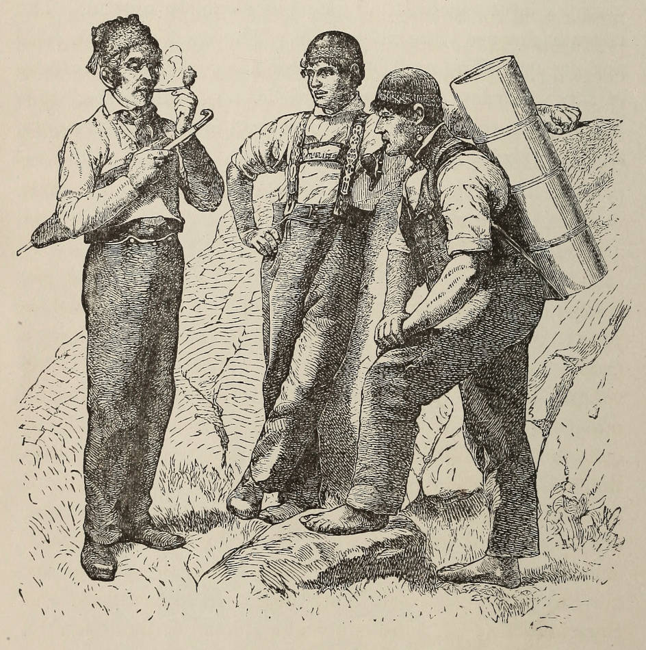 The women sat on one side of the middle aisle, the men on the other. The men were fine looking, generally of good height and stalwart. The women were not good looking. They wore no peculiar costume. Many had bonnets on. Some had only a handkerchief on their heads, of white, yellow, red, or spotted, as the taste of each suggested. Some elderly ladies wore white lace or muslin caps, extending in front, and some had a black silk cap on the back of their heads. The men wore plain, black clothes, coarse, but clean and decent.