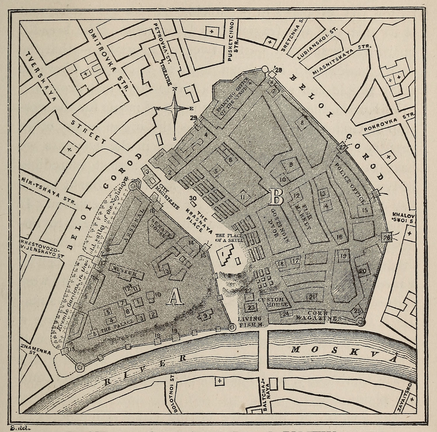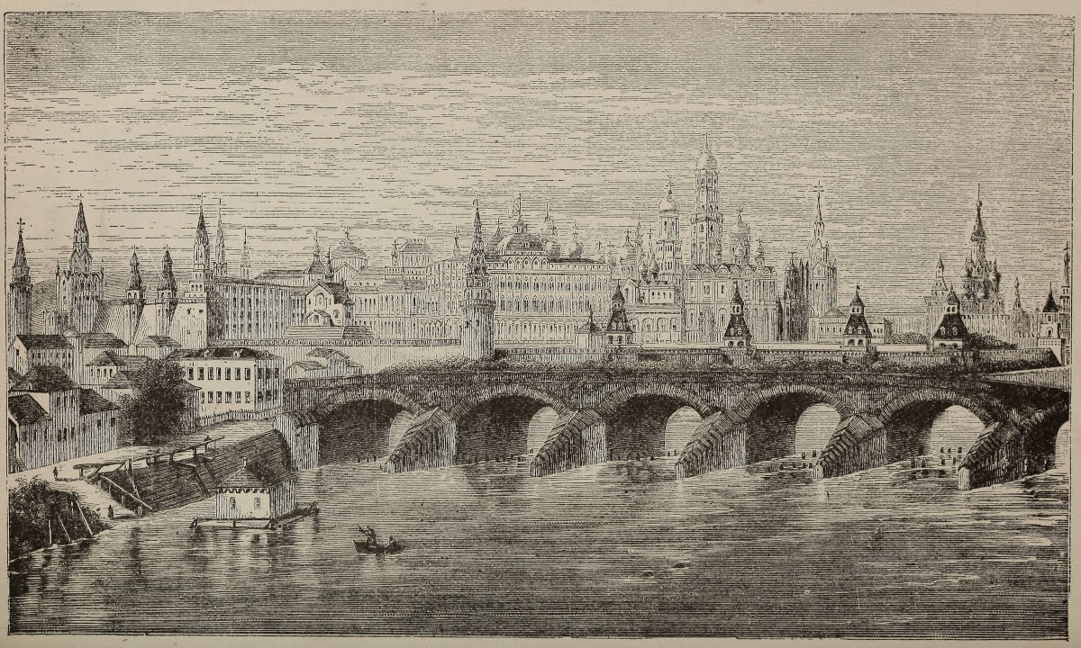 Commercial Travellers.—Sparrow Hills.—Church of the Saviour.—Simonoff Monastery.—Novo-Devichi Convent.—The Moskva.—A Holiday.—Napoleon’s March.—Borodino.—Evacuation of Moscow.—French Enthusiasm.—Triumphal Entry.—Surprise.—Incendiarism.—Return of the French.—Horrors of the March.—Russian Barbarism.—Public Kissing.—From Moscow to St. Petersburg.—Fussy Ladies.—Klin.—Dinner.—Tver.—Beggars.—Night without Darkness.—The Fussy Ladies again.—Sunrise.—Marriage Customs