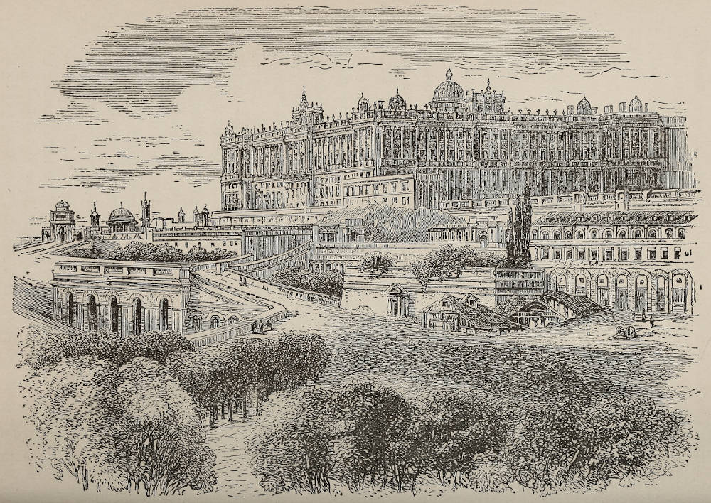 Napoleon’s Epigram.—Royal Palace.—Cavalry.—Military Parade.—Plains of Castile.—Armory.—Swords of Gonzalo de Cordova, Ferdinand, and Charles V.—Armor of Boabdil.—Revolvers.—Mighty Men of War.—Toledo Blade.—Stables.—Spanish Horses.—Merino Sheep.—Royal Equipage.—Crazy Jane’s Carriage.—Her Effigy.—Mischievous Display.—French Language and Influence.—Slow Coaches.—Cheap Labor.—Architecture.—Banking-house.—Bank of Spain.—Repose of Manner.—Gold at last.—Railroads.—Post-office.—Personal Identity.—Rebel General.—Lost Letters.—Telegraphs.—Progress.—Picture-gallery.—The Immaculate Conception.—Vision of St. Bernard.—Christ sinking under his Cross.—Equestrian Portrait of Charles V.—Titian.—Correggio.—Mary in the Garden.—Blas del Prado.—Hidden Gems.—Murillo.—Material and Ideal Art
