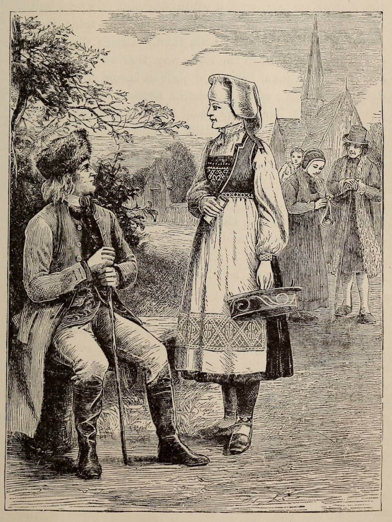 Much more pleasant to look upon, and a memento of a very curious and perhaps a pleasing custom, which, however, is not of the by-gone times, but still common in Scandinavia, at least in the Bergen district, is the crown and girdle and frontlet worn by the bride on the wedding day. But all brides are not allowed to wear such ornaments as these: only brides who have been good girls all the time before. If they have been naughty, they must be married 451without these distinctions, and we may well believe that they are therefore very highly esteemed among young women in the north country. It seems to intimate, also, that it is not altogether a rare thing for a bride to be deprived of the privilege of being thus distinguished, for it is hardly possible that such a state of society can exist anywhere as to have an advertisement made at a wedding that a bride is no better than she should be. But the manners and customs of the world are very queer to the notions of those whose manners and customs are very different, and in no part of domestic life are these habits so monstrously diverse as in the matter of wedding ceremonies.