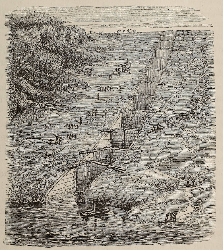 Trollhatten does not attempt such a feat. But the river is caught among a mass of rocks in a narrow gorge, just where the mountains break down to the valley, and the stream comes roaring, tumbling, foaming, rushing headlong with power, fury, madness, indescribable. Water in motion is always beautiful, and when a mighty volume of it is struggling with resisting forces, tearing its way over and down the jagged rocks, and among the green trees of overhanging precipices, what is beautiful becomes sublime and fearful, and admiration rises into awe. In one place the rocks have been actually cut away by art to allow the passage of the water for use, and then the torrent leaps seventy feet at one bound into a frightful abyss. One lofty rock, with a broad, smooth face, like a great tablet, is inscribed with the names of kings, and the dates of their visit to this romantic and interesting spot.