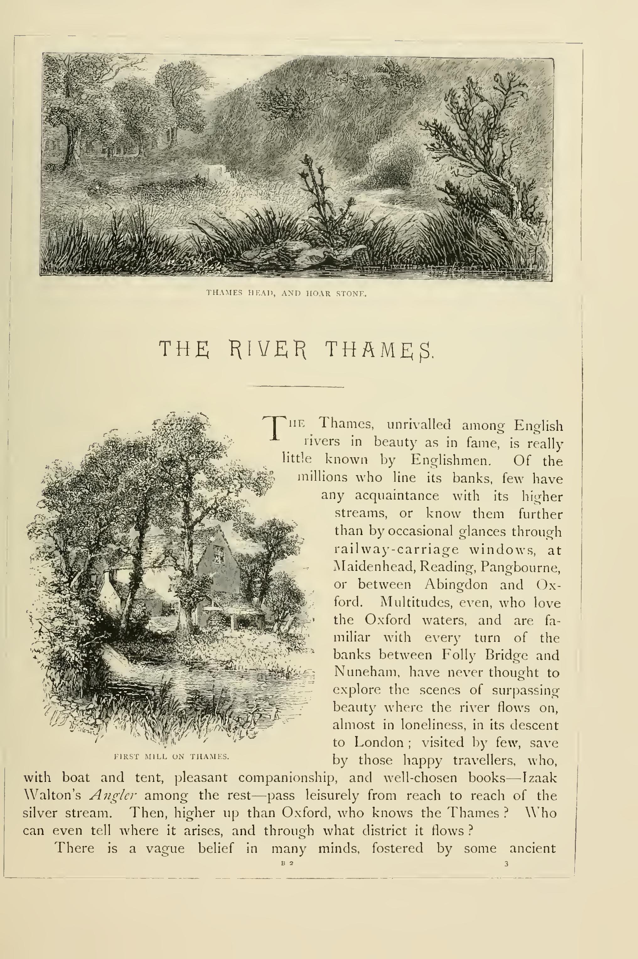 THE Thames, unrivalled among English rivers in beauty as in fame, is really little known by Englishmen. Of the millions who line its banks, few have any acquaintance with its higher streams, or know them further than by occasional glances through rail way-carriage windows, at Maidenhead, Reading, Pangbourne, or between Abingdon and Oxford. Multitudes, even, who love the Oxford waters, and are familiar with every turn of the banks between Folly Bridge and Nuneham, have never thought to explore the scenes of surpassing beauty where the river flows on, almost in loneliness, in its descent to London; visited by few, save by those happy travellers, who, with boat and tent, pleasant companionship, and well-chosen books—Izaak Walton's Angler among the rest—pass leisurely from reach to reach of the silver stream. Then, higher up than Oxford, who knows the Thames? Who can even tell where it arises, and through what district it flows?