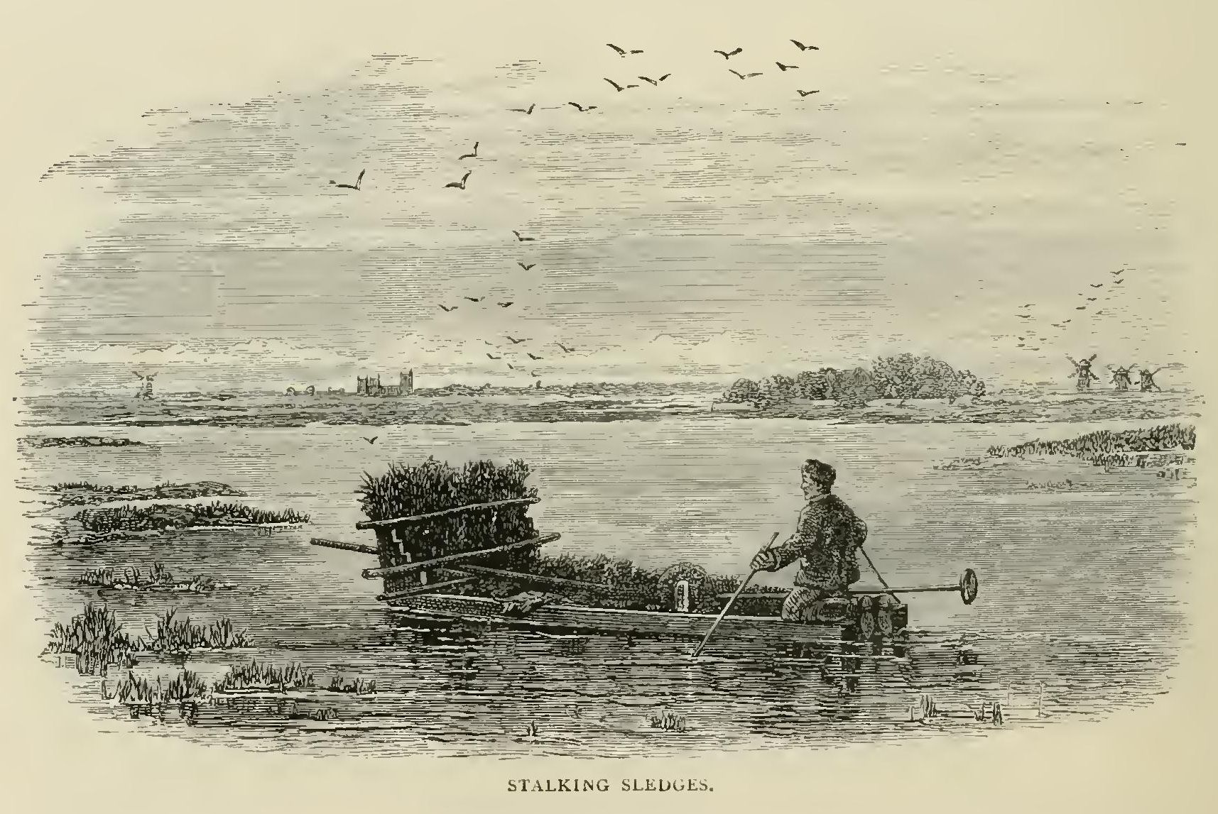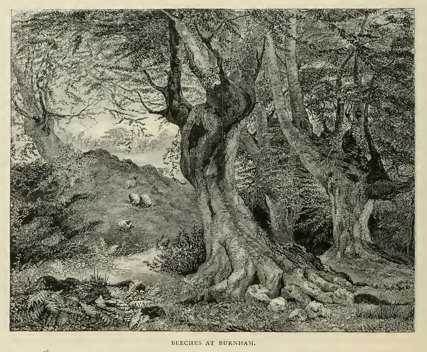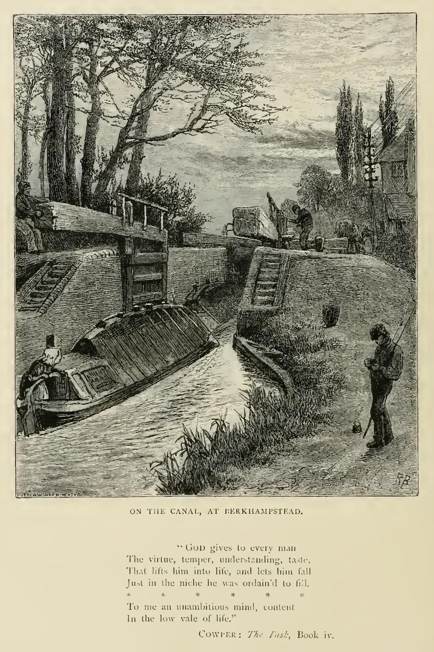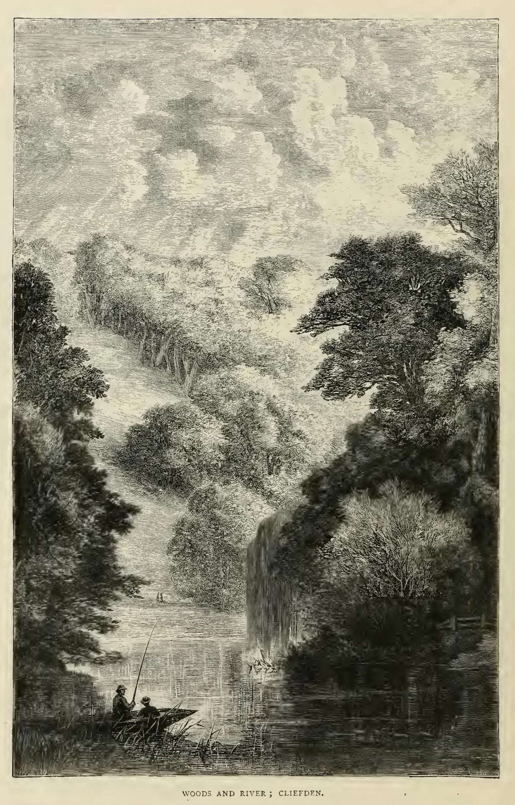 Yet there is no lack of variety. The course of the river is broken up by innumerable "aits" ("eyots"), or little islands; some covered with trees which dip their branches into the stream, others with reeds and osier, the haunts of wild fowl; on others, again, a cottage or a summer-house peeps out from amongst the foliage. Sometimes these aits seem to block up the channel, and leave no exit, so that the boat seems to be afloat on a tiny lake, till a stroke or two of the oar discloses a narrow passage into the stream beyond. Sometimes a line of chalk down bounds the view, its delicately curved sides dotted over with juniper bushes, the dark green of which contrasts finely with the light grey of the turf. Then comes a range of hanging beech-wood coming down to the water's edge, or a broad expanse of meadow, where the cattle wade knee-deep in grass, or a mansion whose grounds have been transformed into a paradise by lavish expenditure and fine taste, or a village, the rustic beauty of which might realise the dreams of poet or of painter. The locks, mill-dams, or weirs with their dashing waters, give animation to the scene. Nor is that additional charm often wanting, of which Dr. Johnson used to speak. "The finest landscape in the world," he would say, "is improved by a good inn in the foreground." True, there are no great hotels, after the modern fashion; but a series of comfortable homely village inns will be found, such as Izaak Walton loved, and which are still favourite haunts with the brethren of "the gentle craft." The landlord, learned in all anglers' lore, is delighted to show where the big pike lies in a sedgy pool, where the perch will bite most freely, or to suggest the most killing fly to cast for trout over the mill-pond; and is not too proud, when the day's task is done, to wait upon the oarsman or the angler at his evening meal.