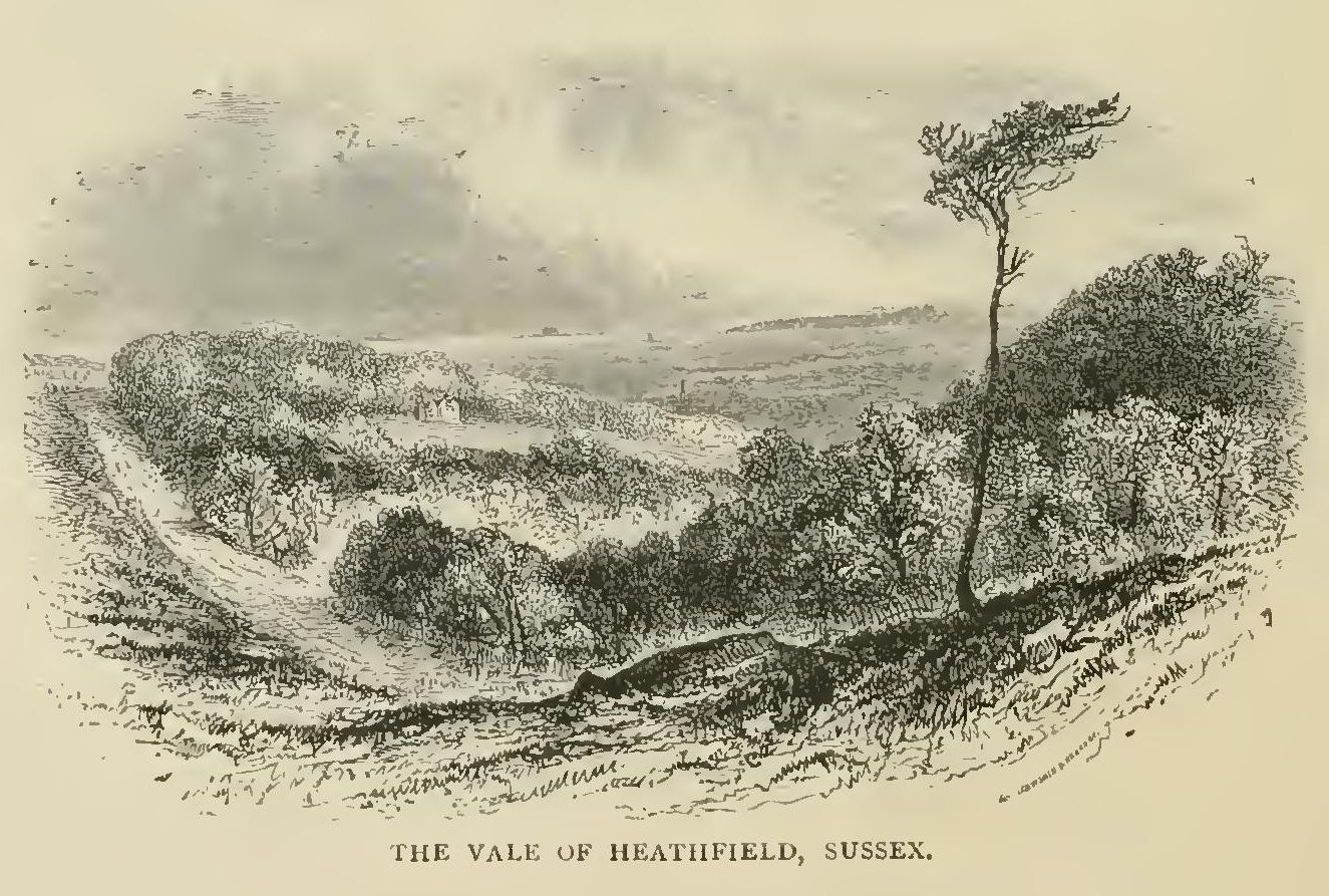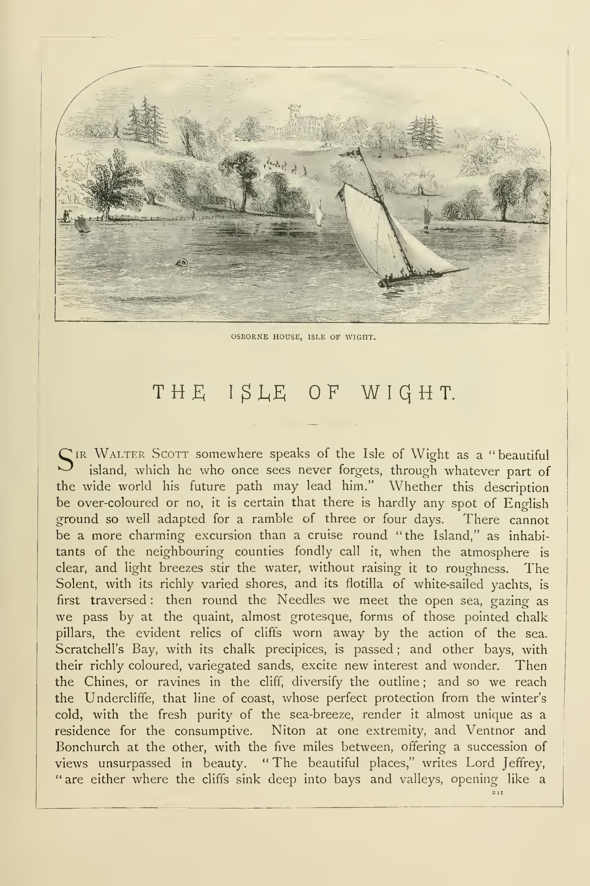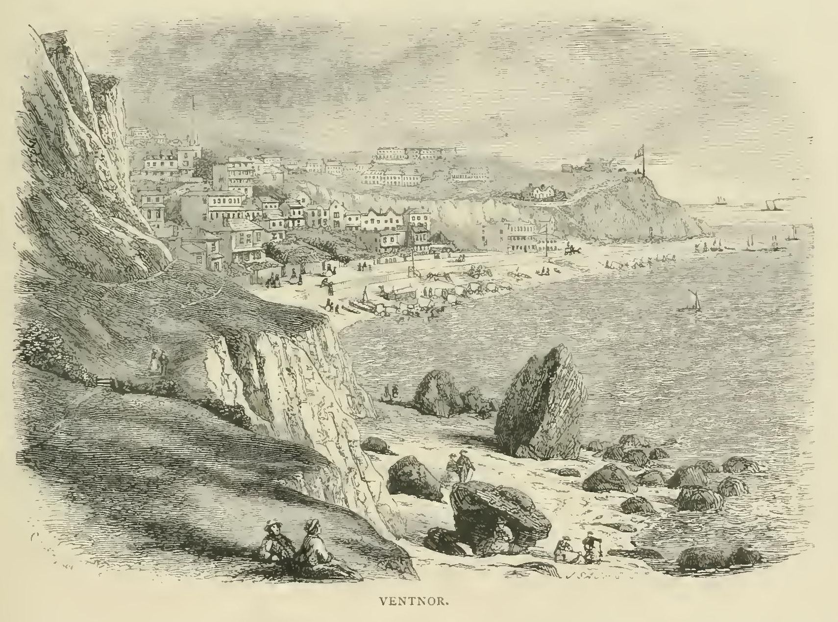 SIR Walter Scott somewhere speaks of the Isle of Wight as a "beautiful island, which he who once sees never forgets, through whatever part of the wide world his future path may lead him." Whether this description be over-coloured or no, it is certain that there is hardly any spot of English ground so well adapted for a ramble of three or four days. There cannot be a more charming excursion than a cruise round "the Island," as inhabitants of the neighbouring counties fondly call it, when the atmosphere is clear, and light breezes stir the water, without raising it to roughness. The Solent, with its richly varied shores, and its flotilla of white-sailed yachts, is first traversed: then round the Needles we meet the open sea, gazing as we pass by at the quaint, almost grotesque, forms of those pointed chalk pillars, the evident relics of cliffs worn away by the action of the sea. Scratchell's Bay, with its chalk precipices, is passed; and other bays, with their richly coloured, variegated sands, excite new interest and wonder. Then the Chines, or ravines in the cliff, diversify the outline; and so we reach the Undercliffe, that line of coast, whose perfect protection from the winter's cold, with the fresh purity of the sea-breeze, render it almost unique as a residence for the consumptive. Niton at one extremity, and Ventnor and Bonchurch at the other, with the five miles between, offering a succession of views unsurpassed in beauty. "The beautiful places," writes Lord Jeffrey, "are either where the cliffs sink deep into bays and valleys, opening like a theatre to the sun and the sea, or where there has been a terrace of low land formed at their feet, which stretches under the shelter of that enormous wall like a rich garden plot, all roughened over with masses of rock fallen in distant ages, and overshadowed with thickets of myrtle and rose and geranium, which all grow wild here in great luxuriance and profusion."
