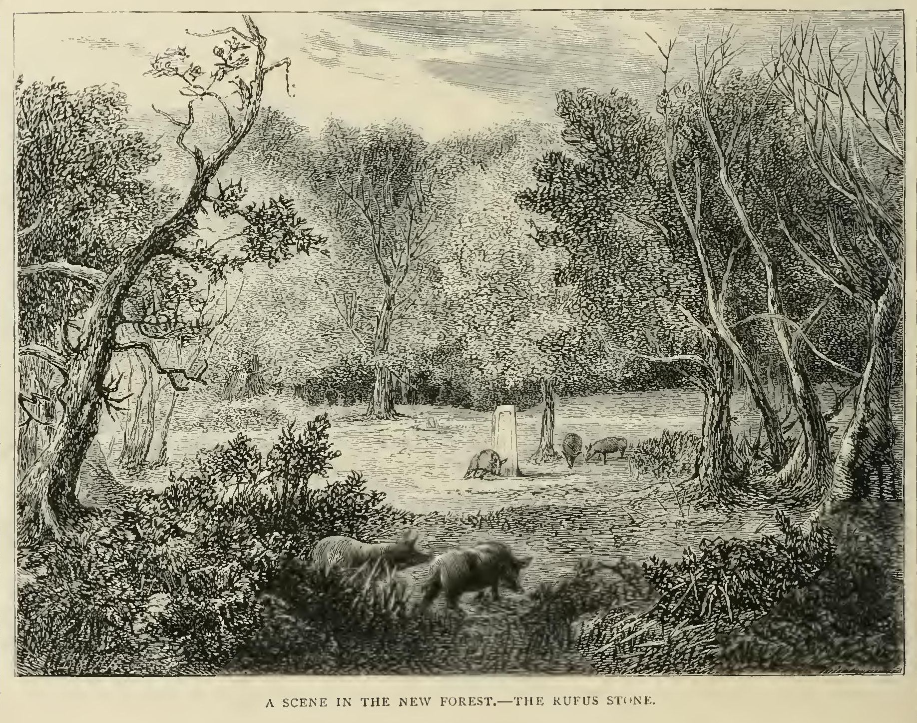 The name, then, of the Thames is singular, not plural; while yet the river is formed of many confluent streams descending from the Cotswold Hills. Which is the actual source is perhaps a question of words; and yet it is one as keenly contended, and by as many competing localities, as the birthplace of Homer was of old. Of the seven, however, only two can show a plausible case. The traditional Thames Head is in Trewsbury Mead, three miles from Cirencester, not far from the Tetbury Road Station, on the Great Western Railway, and hard by the old Roman road of Akeman Street, one of the four ** that radiate from Cirencester, or, as the Romans called the city, Corinium. Here the infant stream is at once pressed into service, its waters being pumped up into the Thames and Severn Canal, whose high embankment forms the back-ground to the wooded nook which forms the cradle of the river. It is an impressive comment on the reported saying of Brindley the engineer, that "the great use of rivers is to feed canals." Half-a-mile farther down, and when clear of the great pumping-engine, the baby river issues again to light in a secluded dell, and now has room to wander at its own sweet will. The cut on the preceding page delineates its early course, and shows "the Hoar Stone," an ancient boundary, mentioned in a charter of King Æthelstan, a.d. 931.