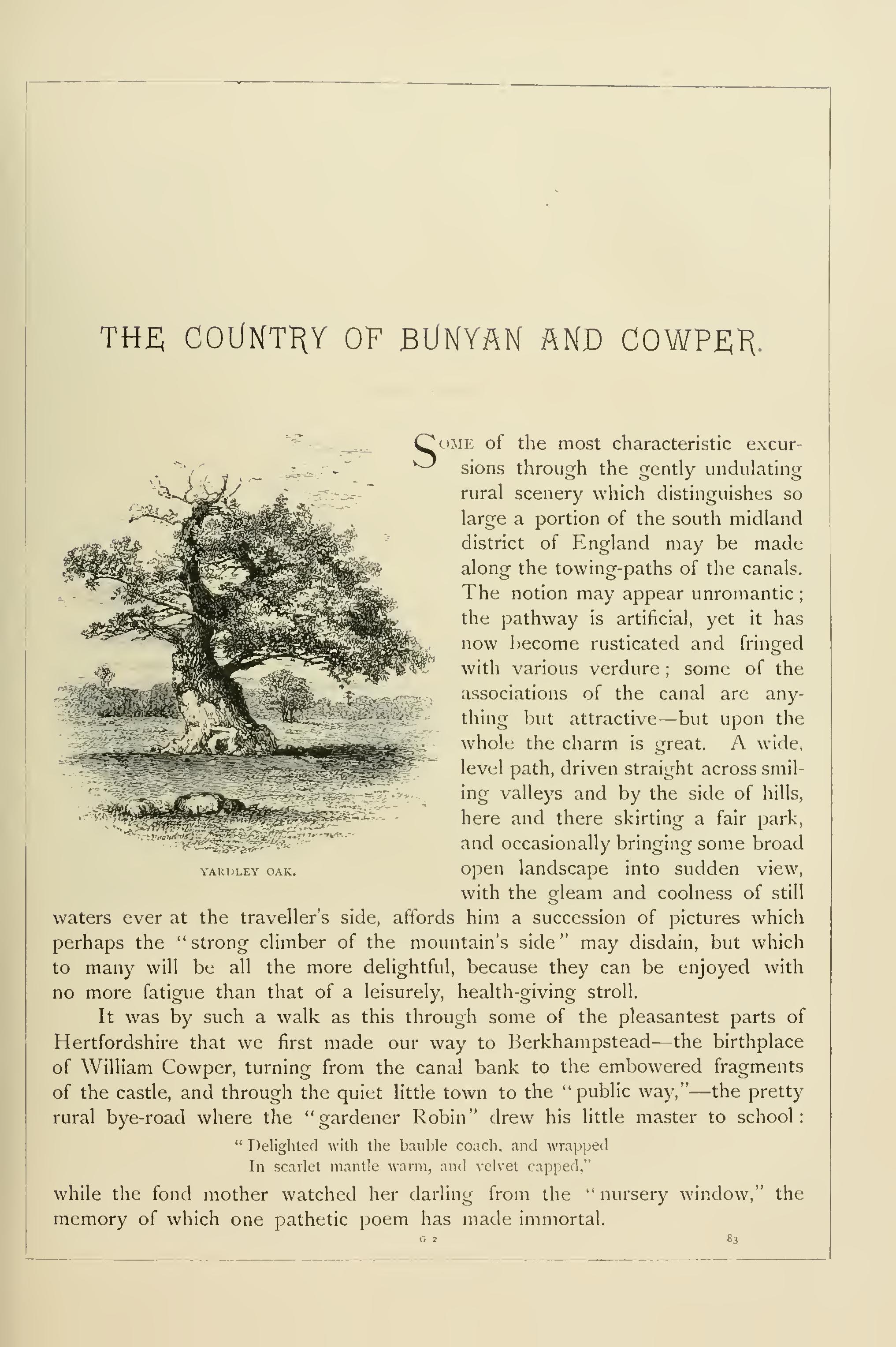 Ralph Waldo Emerson says of the English landscape, that "it seems to be finished with the pencil instead of the plough." Our fields are cultivated like gardens. Neat, trim hedgerows, picturesque villages, spires peeping from among groves of trees, cottages gay with flowers and evergreens, suggest that the landscape gardener rather than the agriculturist has been everywhere at work. If this be true of England as a whole, it is yet more strikingly true of the district through which we are about to pass. A thousand years of peaceful industry have subdued the wildness of nature; and the river glides between banks radiant with beauty: "The little hills rejoice on every side; the pastures are clothed with Hocks, the valleys are covered over with corn; they shout for joy, they also sing."