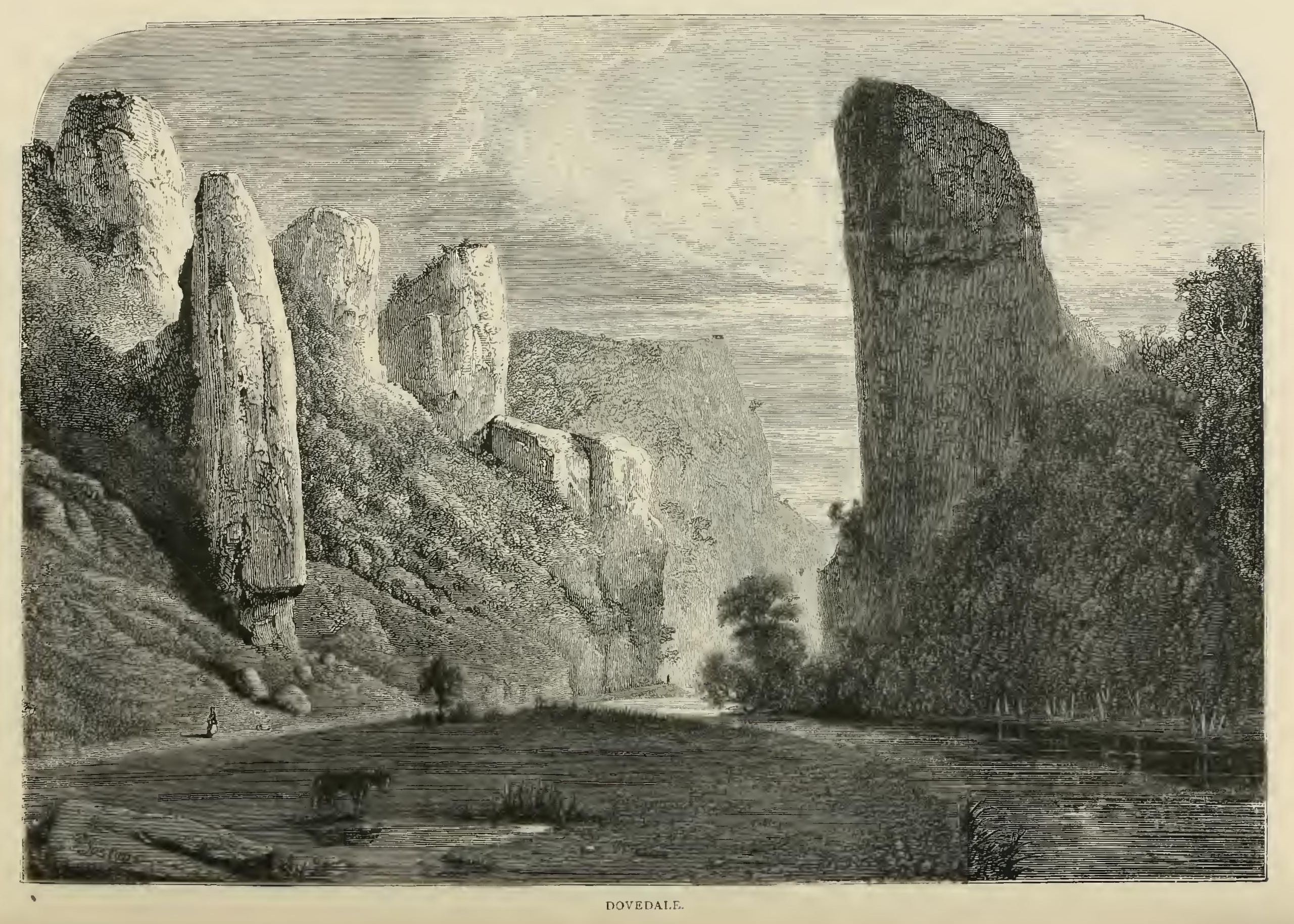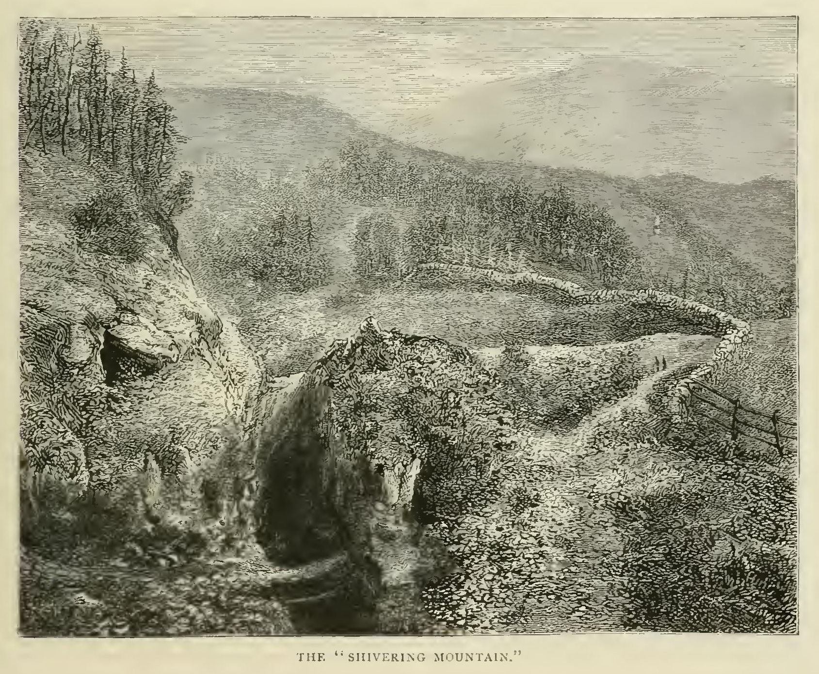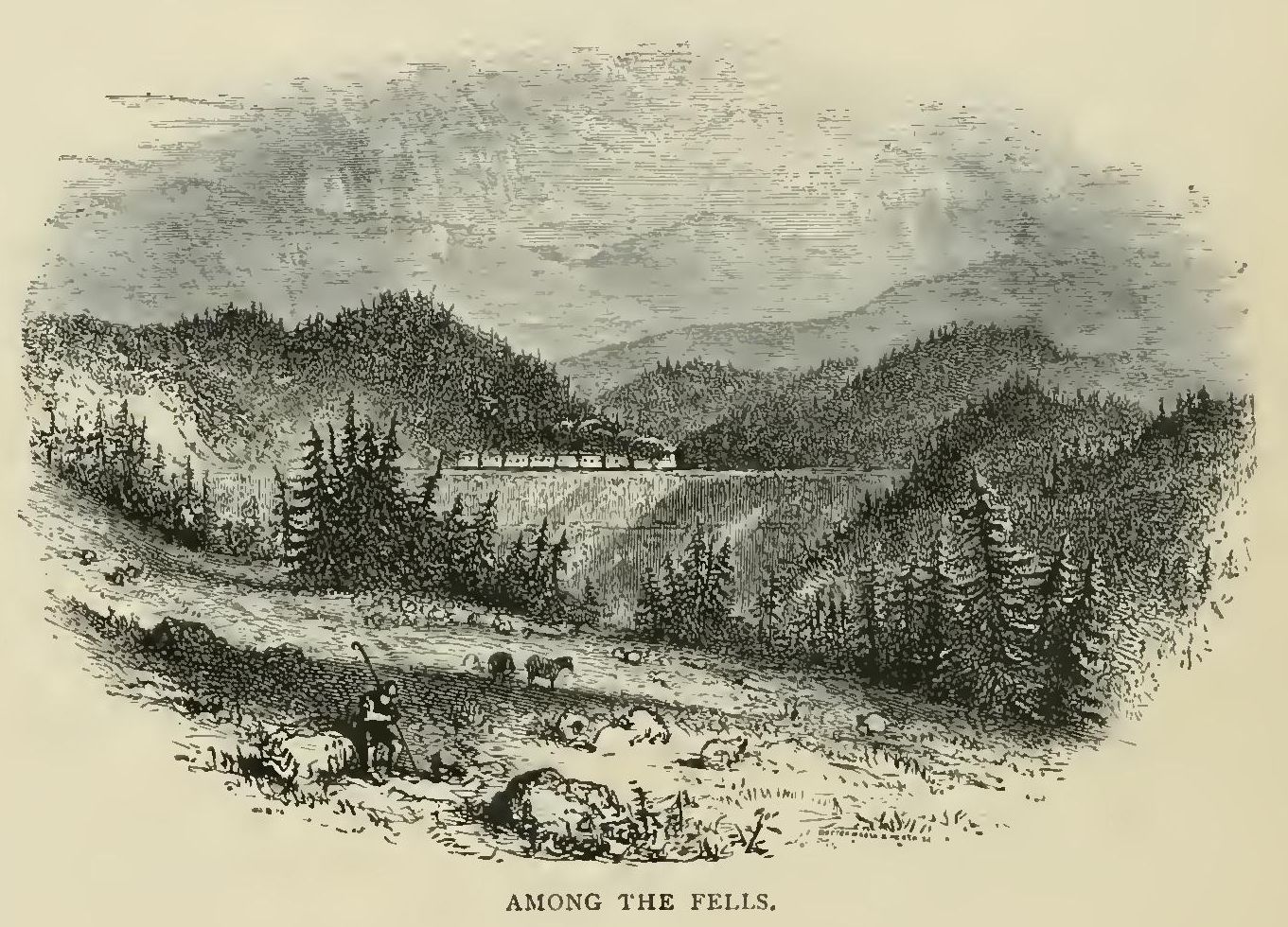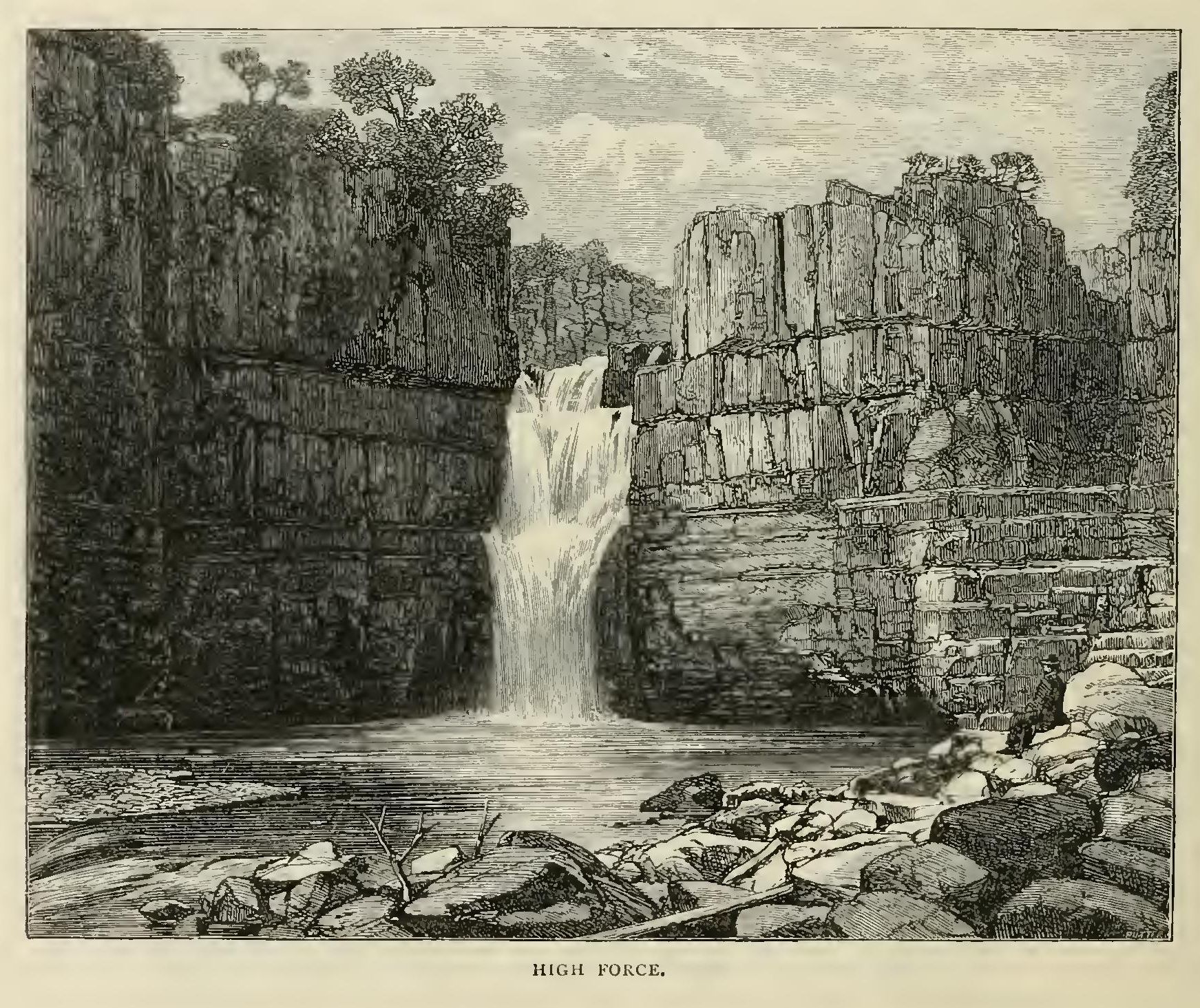 Still pursuing our way northwards, we reach the country of the Yorkshire Dales, where the Swale, passing by Richmond, the Tees, on the edge of Durham, and many smaller streams, descend from the eastern slope of the Westmoreland moors. Both abound in wild and charming scenery: the upper Tees-dale especially is singularly impressive. The river runs in its deep rocky bed through alpine-looking green meadows, with clean whitewashed cottages scattered here and there. Trees there are few or none, except a small kind of fir; and in place of hedges, low stone walls mark the boundaries of the fields. About five or six miles below its source, there forms the striking waterfall "High Force," tumbling over a black basaltic precipice, fifty feet high; while yet higher up the stream, where it issues from a gloomy tarn on the edge of the Westmoreland moors, descending for some two hundred feet over a steep, irregular staircase, so to speak, of basalt, the weird wildness of the scene, in the midst of its hilly amphitheatre, approaches sublimity. Caldron Snout is the quaint name of this unique rapid, and the curious in geology, as well as the lover of the picturesque, will be well repaid by a visit.