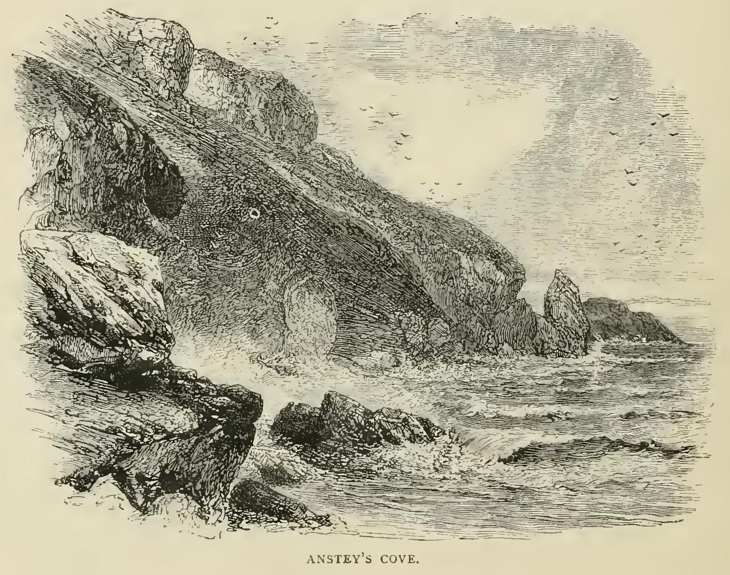 "Improvement" has been direfully at work since first we visited this little village and drank of the cool waters of "St. Lawrence's Well." The white, well-kept road is more level than the old picturesque path; instead of ivied cottages there are now shining villas with green blinds, walls for hedgerows, and, worst of all, the gushing spring flows somewhere in an inclosure to which there seems no access. It is a pity to have thus modernised so rustic and lovely a spot. But the flowers are still there, perfuming the air; and the myrtles and the fuchsias are not shrubs, but trees, and the luxuriance of southern climes surrounds us. As we walk along we speculate on the convulsions of nature that have prepared for us this little paradise. The undulating ground at our feet is evidently formed of vast masses of chalk and clay, which, at former periods, have broken bodily from the face of the cliff, slipped forward, and sunk down. The surface, disintegrated by aqueous and atmospheric action, has formed a kind of irregular terrace, the soil of which is most favourable to vegetation. The ground is now firm, the process of disintegration from above seems almost arrested; but there are even yet memories of landslips on a large scale, of which the traces are still visible.
