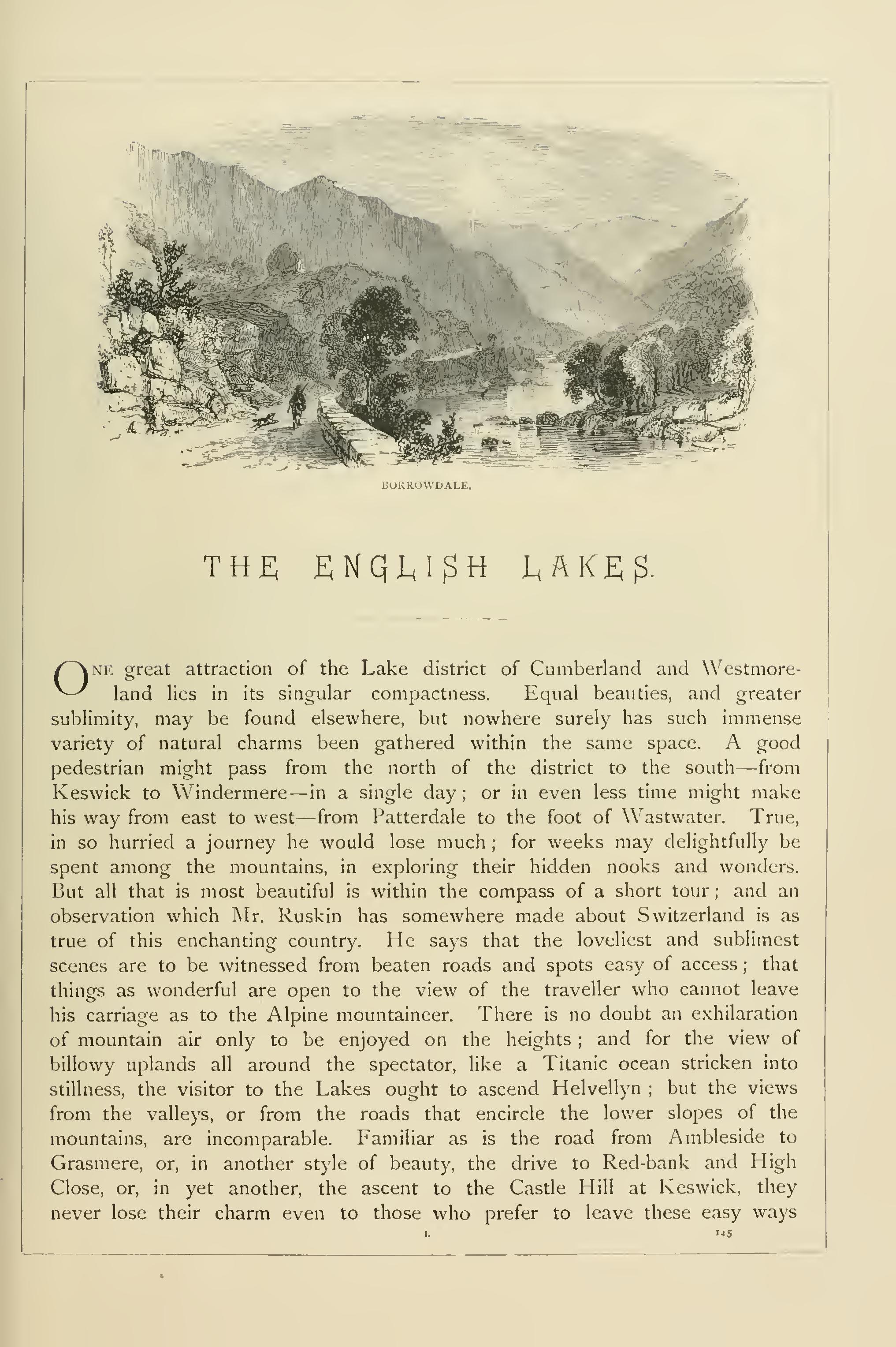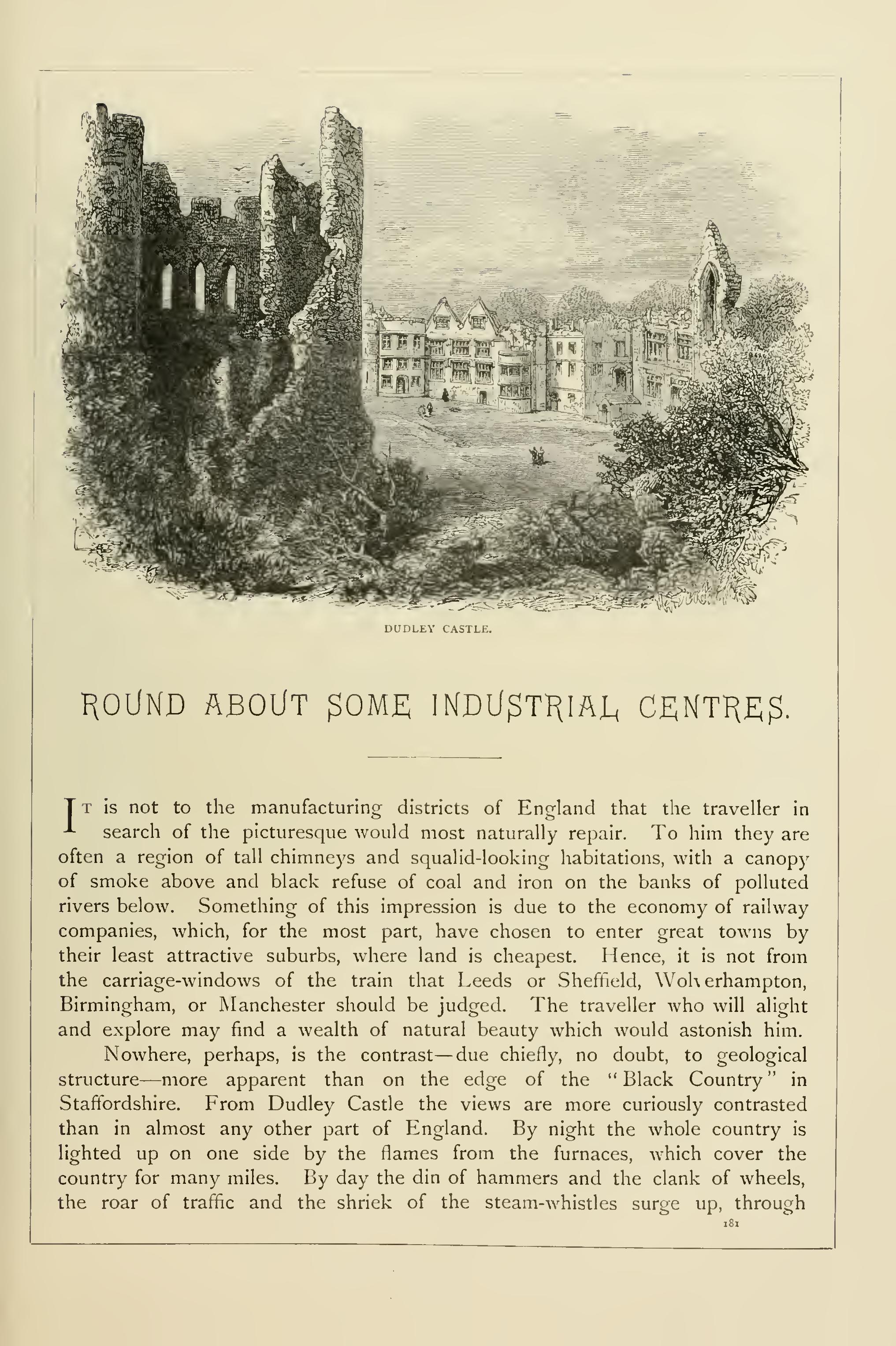 IT is not to the manufacturing districts of England that the traveller in search of the picturesque would most naturally repair. To him they are often a region of tall chimneys and squalid-looking habitations, with a canopy of smoke above and black refuse of coal and iron on the banks of polluted rivers below. Something of this impression is due to the economy of railway companies, which, for the most part, have chosen to enter great towns by their least attractive suburbs, where land is cheapest. Hence, it is not from the carriage-windows of the train that Leeds or Sheffield, Wolverhampton, Birmingham, or Manchester should be judged. The traveller who will alight and explore may find a wealth of natural beauty which would astonish him.